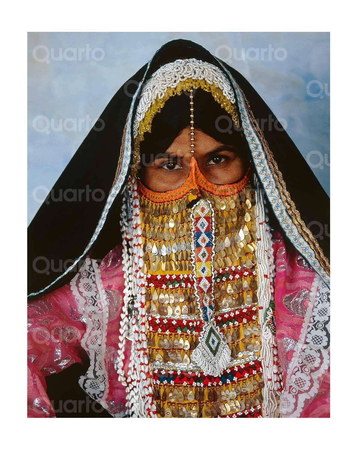 LINKS Een bedoeïenenvrouw draagt een boerka, versierd met goudkleurige metalen hangers, schelpen, plastic kralen, kettingen en een kralenpaneel langs de onderkant van de sluier.