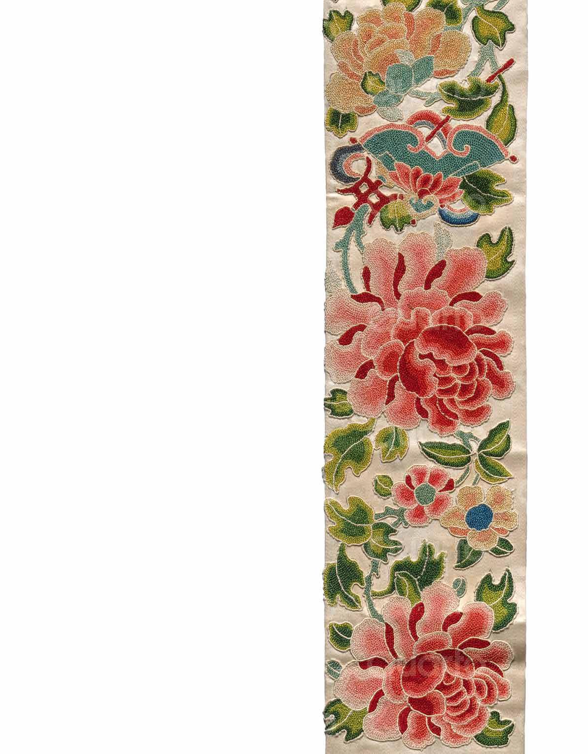 RECHTS Detail van een vroeg twintigsteeeuws geborduurd mouwbandje uit China, met een bloemenmotief in kleine Pekingknoopjes en omlijnd met een wit koord.