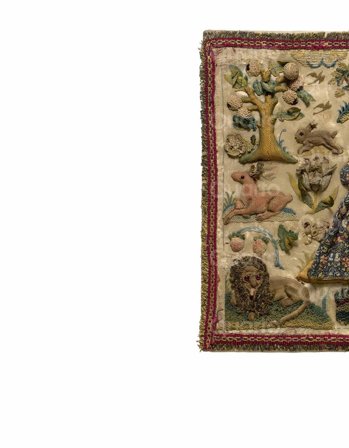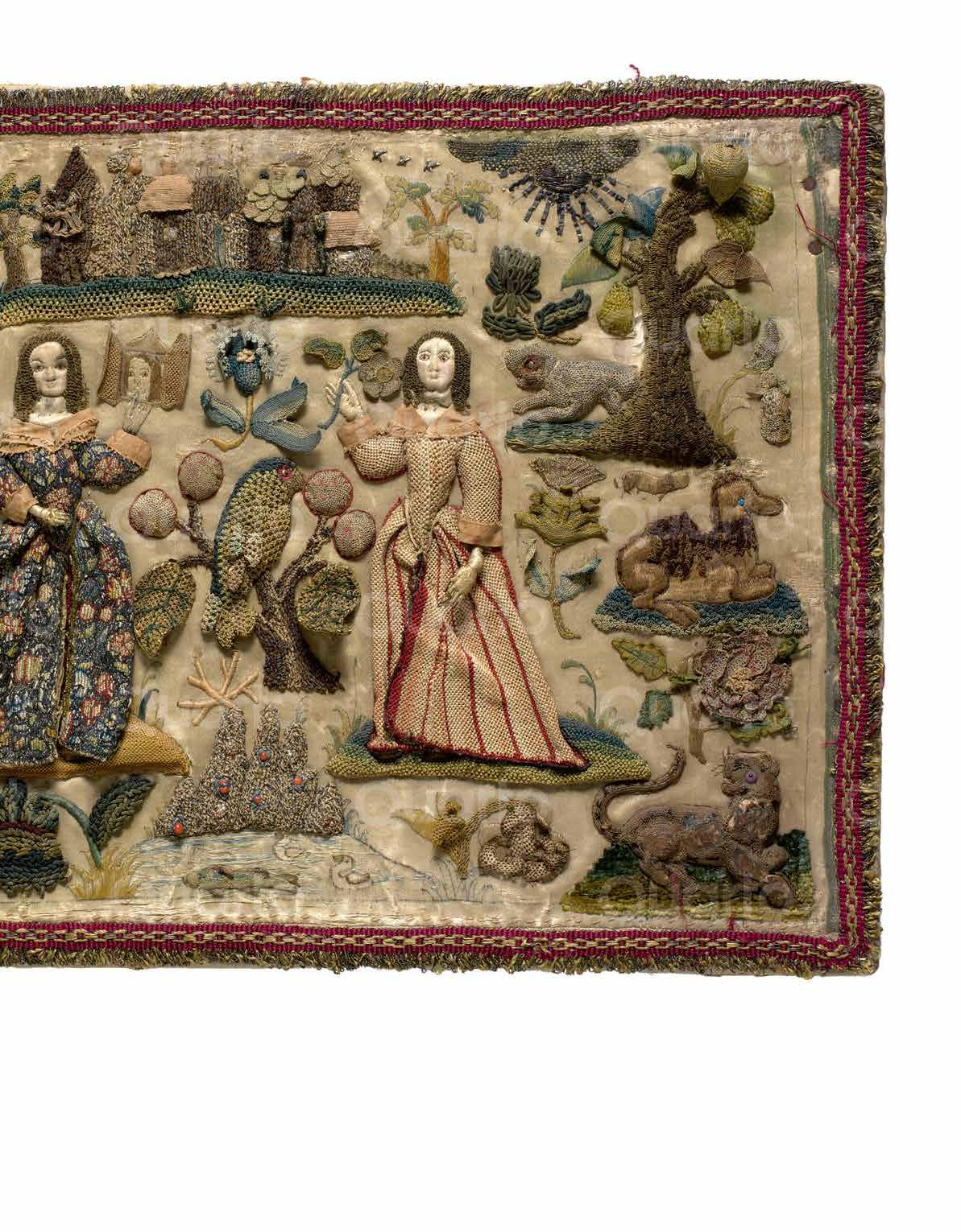 Een stumpworkpaneel uit het late zeventiendeeeuwse GrootBrittannië, waarop twee vrouwen (één met een spiegel) zijn afgebeeld in een landschap vol driedimensionale dieren.