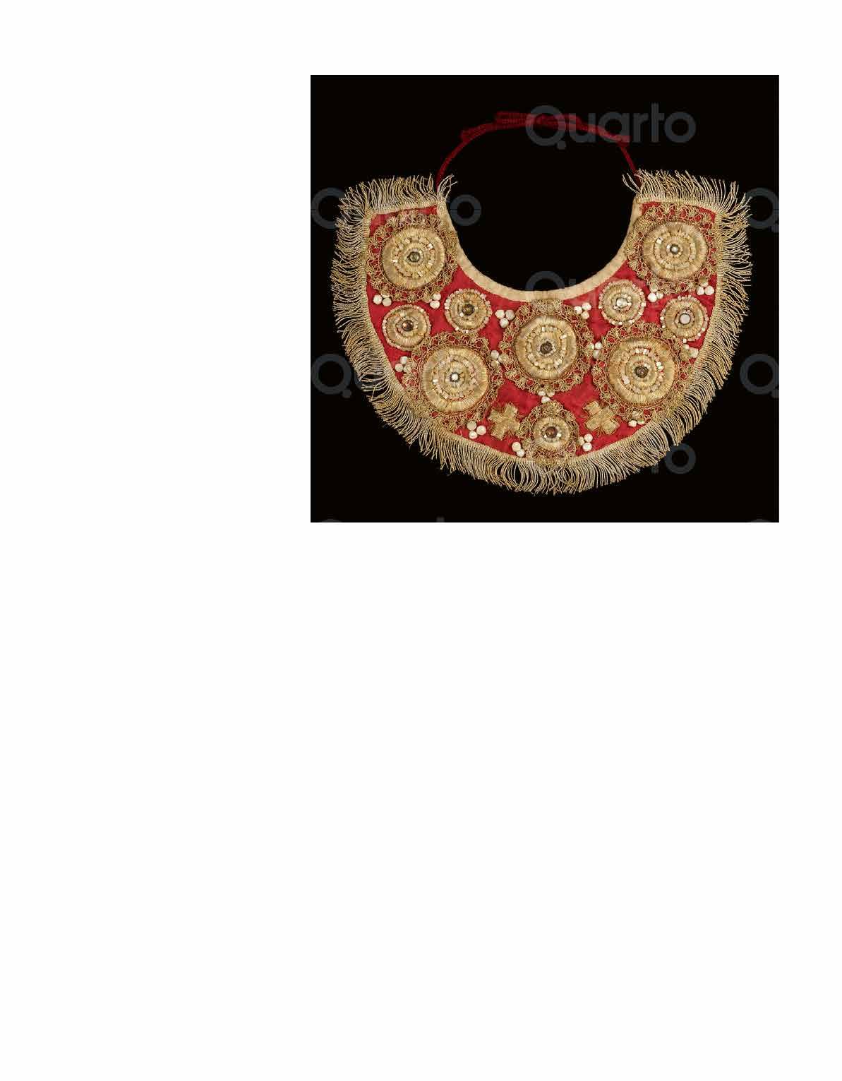 RECHTS Een feestelijke Russische kraag versierd met zijdegaren en gouddraad, maar ook met halfedelstenen, stukjes parelmoer en parels (18301880).