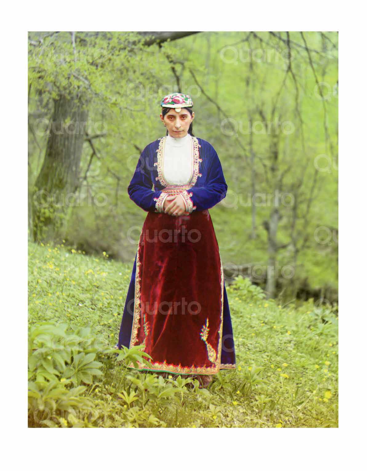 LINKS Een Armeense vrouw, ca. 1910, in feestelijke kleding met geborduurde muts, gilet, rok en schort.