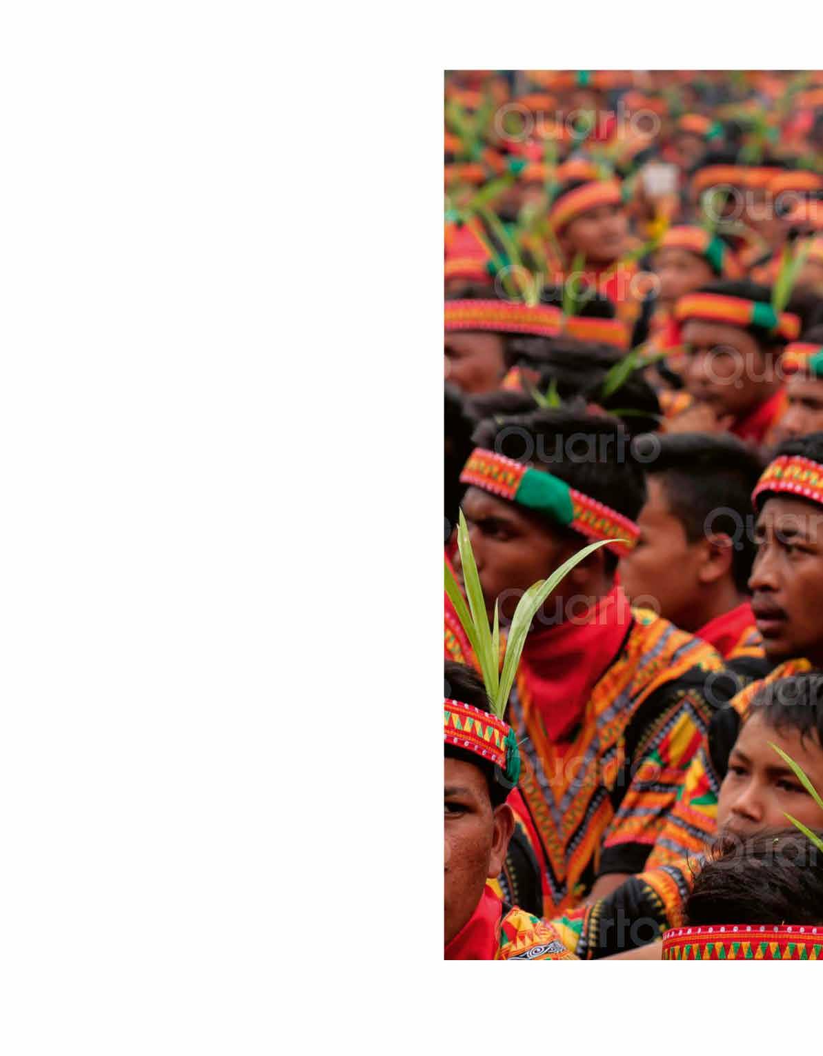 Een grote groep mannen, vrouwen en kinderen uit Atjeh en Gayo voert een traditionele Samandans uit in felgekleurde kleding met geborduurde versiering en details van appliqué. Het feest vond plaats in de provincie Atjeh in 2017, nadat UNESCO de dans in 2011 tot immaterieel cultureel erfgoed had verklaard.