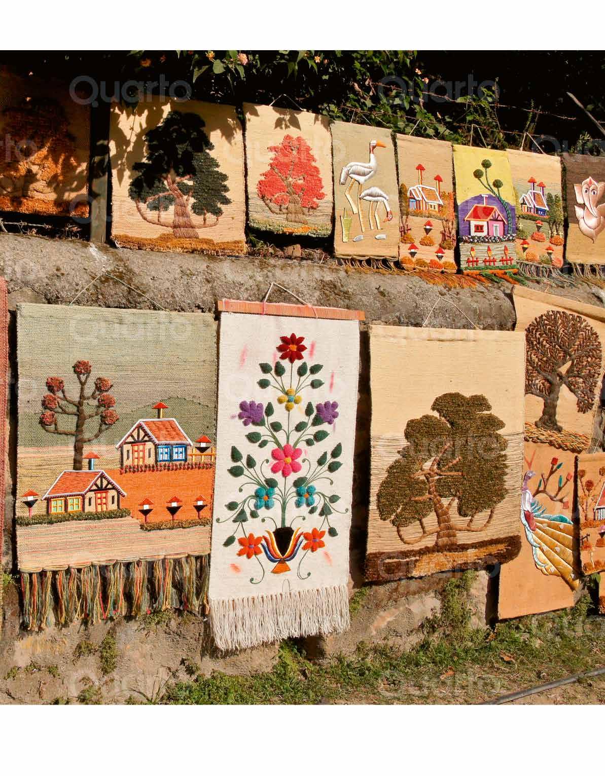 Geweven en geborduurde wandkleden die te koop zijn in Kathmandu, Nepal.