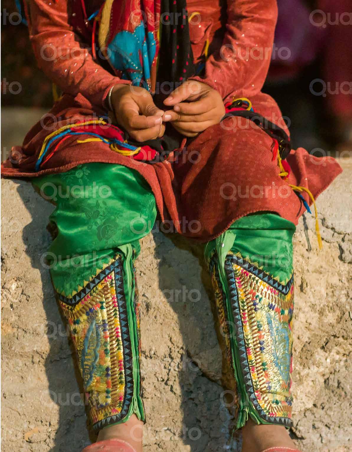 Een meisje op het eiland Qeshm, Iran, gekleed in traditionele kleding, waaronder een broek met geborduurde banden rond de enkels (2015).