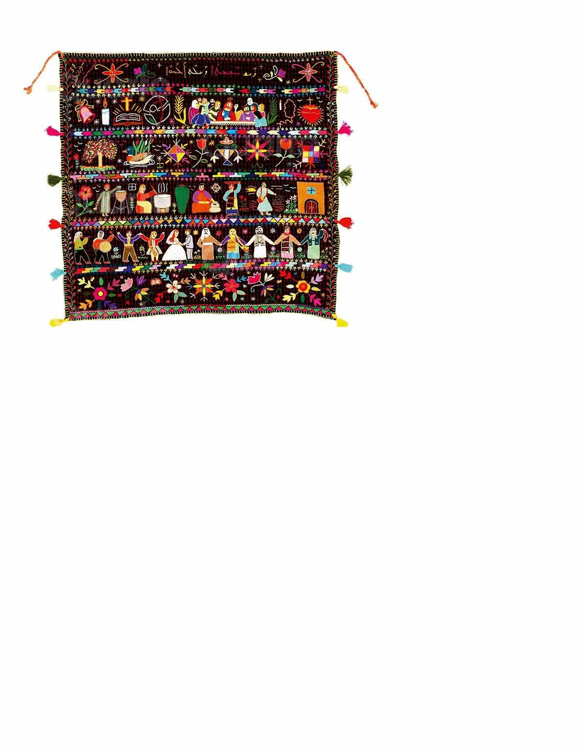 Een groot vierkant Iraaks kledingstuk (charuga) versierd met borduurwerk met christelijke motieven, zoals het Laatste Avondmaal, de kruisiging, een kruis en kaarsen, en met afbeeldingen van mensen die huishoudelijke taken uitvoeren, zoals feesten en bruiloften. De geborduurde tekst op het bovenste paneel luidt: ‘Vrees voor God is het begin van wijsheid.’ De charuga werd in 2021 geborduurd door Suzan Sukari.