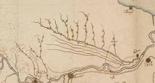 Uitsnede van een grote Veluwekaart. De ‘Nieuwe Rijn’ waarmee hertog Karel van Gelre in 1502 begon maar moest stoppen staat ingetekend (zie witte pijl), hopend op betere tijden. Op latere kaarten is dit nieuwe stuk kanaal in de herinnering weggezakt. Christian Sgrooten, schaal circa 1:115.000.