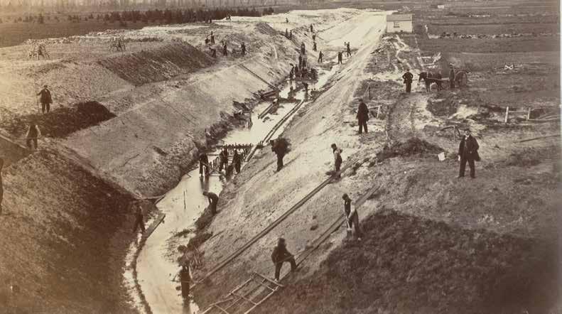 Arbeiders leggen in 1868 de lange Zwaanspreng met twee sprengkoppen aan om het Apeldoorns Kanaal van extra water te voorzien. Het kanaal krijgt tot dan toe alleen water van de Kayersbeek. Voor de aanleg worden heidegronden ten westen van de toenmalige herberg De Zwaan onteigend; aan die herberg dankt de nieuwe sprengbeek haar naam. Het gevolg is wel dat in Ugchelen waterputten droogvallen en meer dan een meter dieper moeten worden gemaakt. De fotograaf noteert: het terrein is 21,70 meter +Amsterdams Peil (AP), de bodem ligt op 16,95 meter +AP. Anoniem. Foto van 22 april 1868