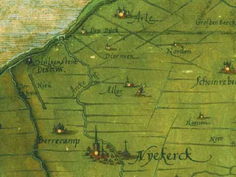 Tussen de dijk (met diverse namen) en ‘Die Suyder See’ liggen ‘Groenlanden’ Nijkerk is met de zee verbonden via ‘Die Spoey Grafte of te Grifte oder Vaerte’ – het laatste stuk van de Breede beek is hier tot een kanaal vergraven. Bernard Kempinck, schaal circa 1:6500.