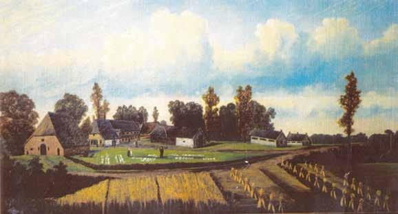 De Eerbeek tussen Loenen en Brummen. De bovenloop begint bij ‘ColdenHove’ (links). De beek stroomt naar twee watermolens en enkele vijvers van ‘Huis te Eertbeck’ dat op de grens tussen hoge enken en lage broeken is gebouwd. De grootste vijver voedt tevens een ‘saetmeul’ – zaad, van graan: een korenmolen. In de negentiende eeuw komt daar ook een oliemolen, met een eigen rad; de olie wordt gewonnen uit lijnzaad en beukennootjes. Isaac van Geelkercken, zonder schaal.
