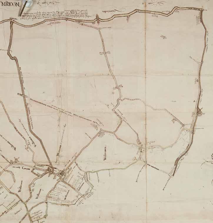 Omgeving Wapenveld, deel van een grotere kaart. Boven ligt een ‘oude verlande Grijft meest zonder water’: dit recht gegraven kanaaltje voldoet niet meer, in tegenstelling tot de deels bedijkte Grift (onder). Maar dan moet wel het water ‘dat van deze bergen valt’ erin stromen. In het midden stond ooit een ‘wintmeŭl’, in 1448 gebouwd door fraters van het inmiddels ‘vervallen’ klooster Hulsbergen, uiterst rechts. Met de restanten is aan de Grift een nieuwe windmolen gebouwd, handiger voor de aan- en afvoer van bijvoorbeeld graan.