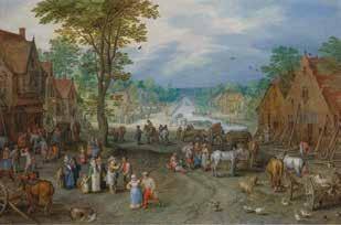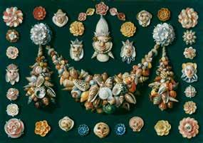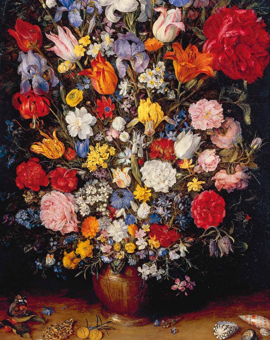 van kunstenaars uit de Brueghelfamilie ook herken bare stadsgezichten te zien. Daaronder bevinden zich afbeeldingen van Antwerpen, waar veel leden van de familie hun artistieke carrière en netwerk hebben uitgebouwd. Deze wereldstad met zijn welvarende [afb. 21] Jan van Kessel de Oude, Guirlande, maskers en rozetten gemaakt van schelpen 1656, olieverf op koper, 40 x 56 cm. Fondation Custodia, Collection Frits Lugt, Parijs