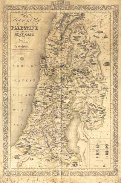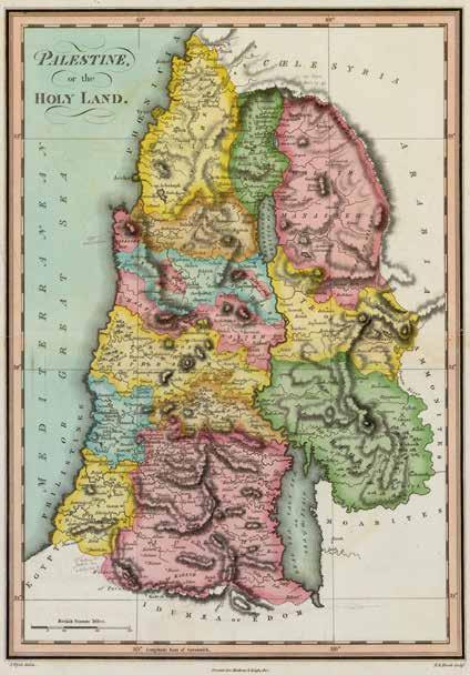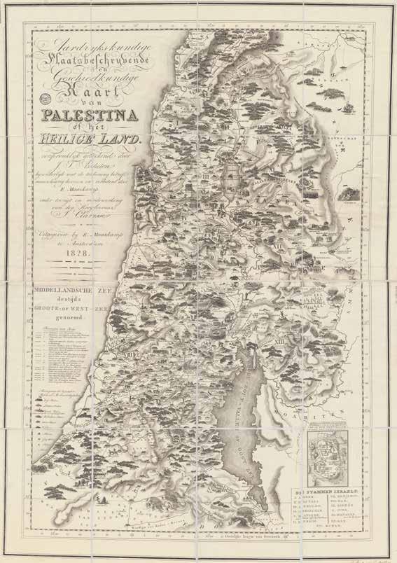 is gedrukt van twee koperplaten en heeft in gemonteerde staat een afmeting van ongeveer 100 x 70 centimeter. In de Collectie Bodel Nijenhuis in de Universitaire Bibliotheken Leiden wordt bij een exemplaar van deze kaart een proeffragment en handgeschreven documentatie bewaard.3 In deze bijdrage bespreek ik hoe de wandkaart van Palestina tot stand is gekomen en vergelijk ik haar met de Engelse kaart waarop zij is gebaseerd. Daarnaast ga ik in op de verschillende uitgaven die van de kaart zijn verschenen en op de wijze waarop de kaart werd ontvangen (afb. 1).