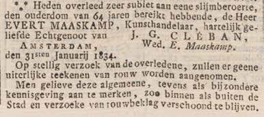 Afb. 4. Overlijdensakte van Evert Maaskamp. Amsterdam, Stadsarchief, archief nr. 50029, inv.nr. 3347, blad 70v wordt ingeschreven.2 In Amsterdam, staat hij in 1793 vermeld als ‘werkend lid’ van de stadstekenacademie. Dat bleef hij maar een jaar en er zijn slechts enkele tekeningen van hem bekend, die van een middelmatig talent getuigen. Wel waren de contacten die hij daar opdeed van groot belang voor zijn latere uitgeverscarrière.3 In 1799 trouwde hij met Johanna Geertruy Cléban (1778-?),4 dochter van de juwelenhandelaar Michiel Cléban (afb. 3). Het echtpaar kreeg geen kinderen, maar Evert kreeg mogelijk wel een dochter Evertje bij Margreeta Steenwoude.5 Evert overleed aan een ‘slijmberoerte’ in Amsterdam op 31 januari 1834 (afb. 4 en 5).