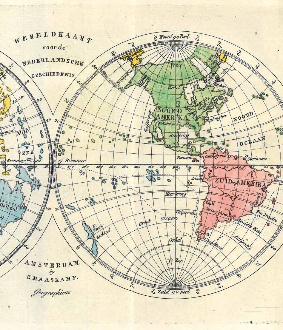 Het handboek bij de Geschiedkundige kaart de Nederlanden dat Maaskamp ter toelichting publiceerde, begint met een handgekleurde wereldkaart van de Nederlandse geschiedenis (afb. 2). Dan volgen een voorwoord, een inleiding tot de geschiedenis van Nederland en een ‘Tijdrekenkundige beschouwing’ van de binnenlandse geschiedenis. Die bestaat uit een tabel met de volgende kolommen: jaartal, gebeurtenis, locatie bestaande uit de provincienaam en nadere aanduiding, noorder- en zuiderbreedte en ooster- en westerlengte. Daarna volgt een tabel met de verrichtingen van de Nederlanders in het buitenland, die verwijst naar de wereldkaart vooraan in het boek.