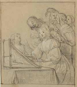 Gerard van Honthorst, Een vrouw die tekent omringd door figuren, ca. 1640. Papier, zwart krijt, penseel en bruine inkt, wit krijt, 250◊224 mm. Particuliere collectie (courtesy Nicolas Schwed)