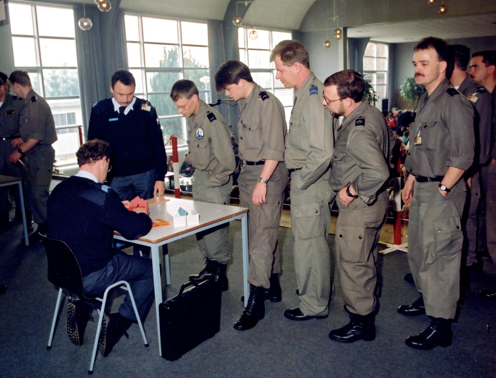 Grondpersoneel van het eerste detachement tijdens het inboeken bij het ‘reisbureau’ voor de vlucht naar Villafranca , beg in april 1993. (Foto nimh)
