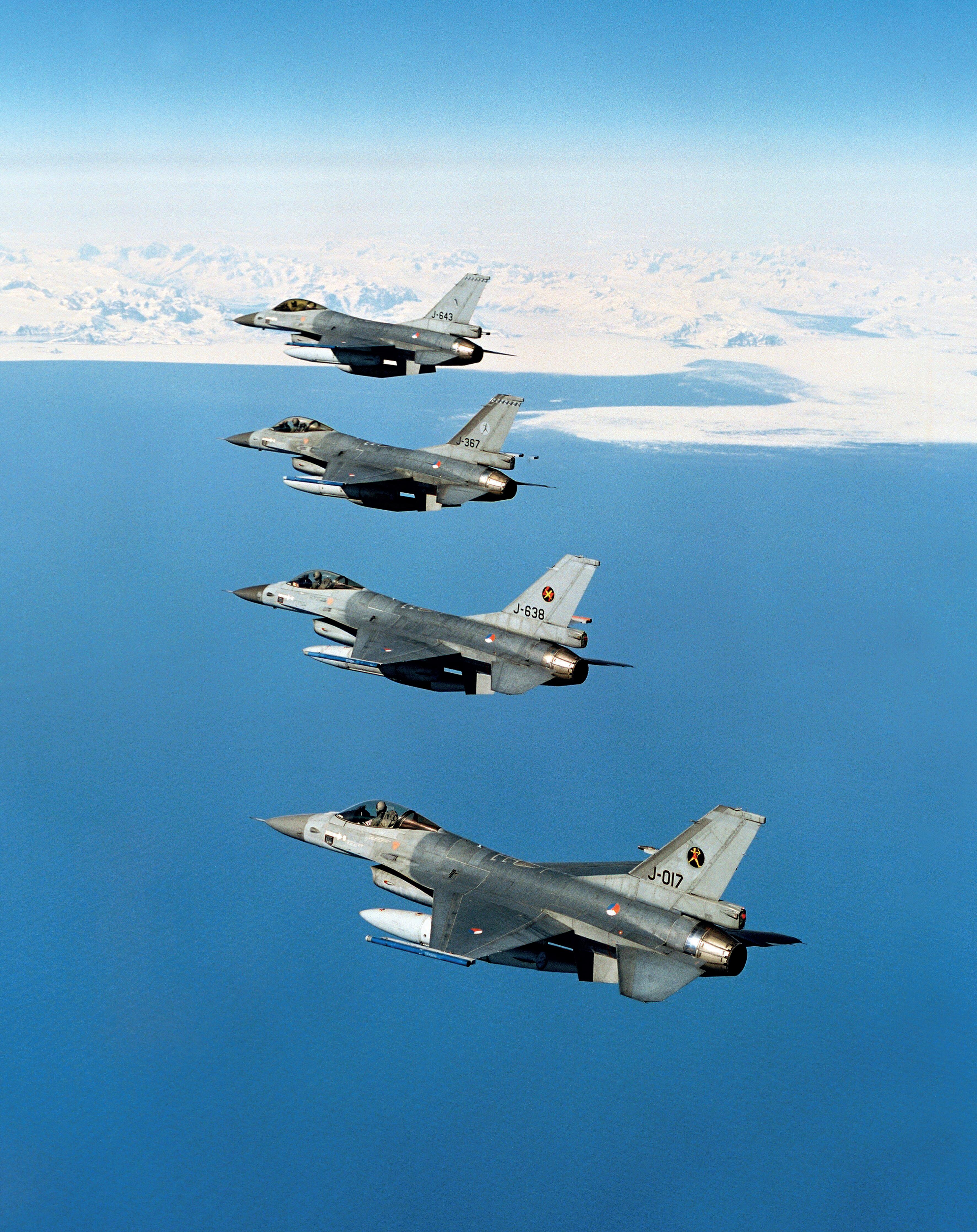 Foto Inhoud : f-16´s van 322, 323 en 312 Squadron passeren Groenland tijdens hun ferr y vlucht naar Goose Bay, Canada (Foto nimh / Fotovlucht Vlieg basis Soesterberg)