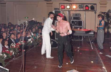 De Arnhemse band The Moans tijdens een reünie in Musis Sacrum in 1984. Op de foto: een fan, Herman Brood en Erlend Josephy. Foto Gerth van Roden.