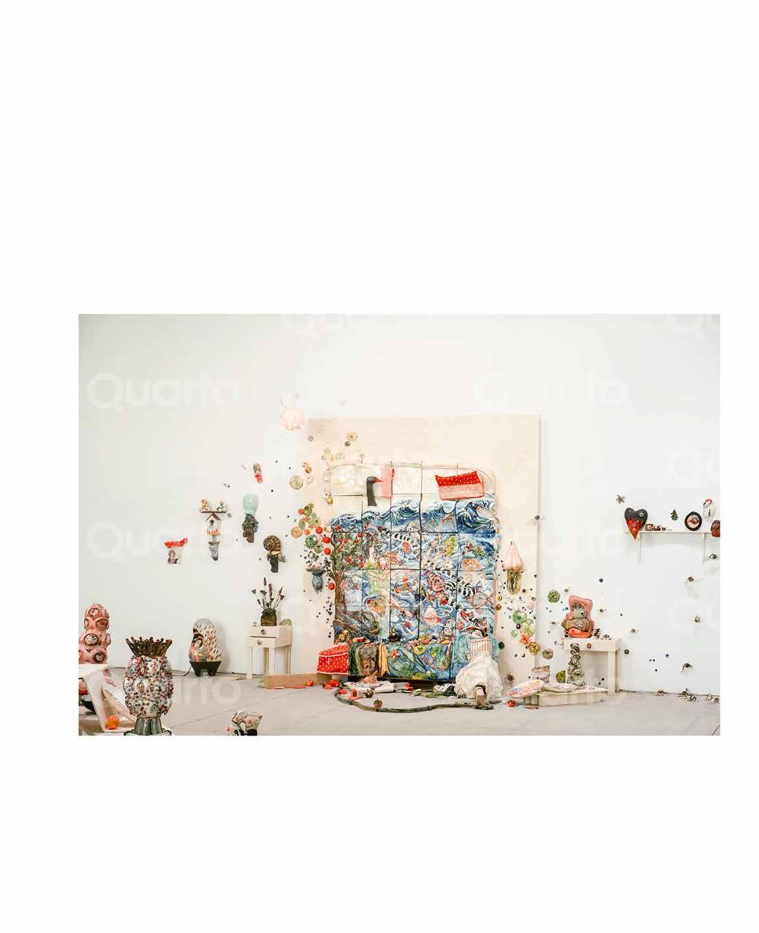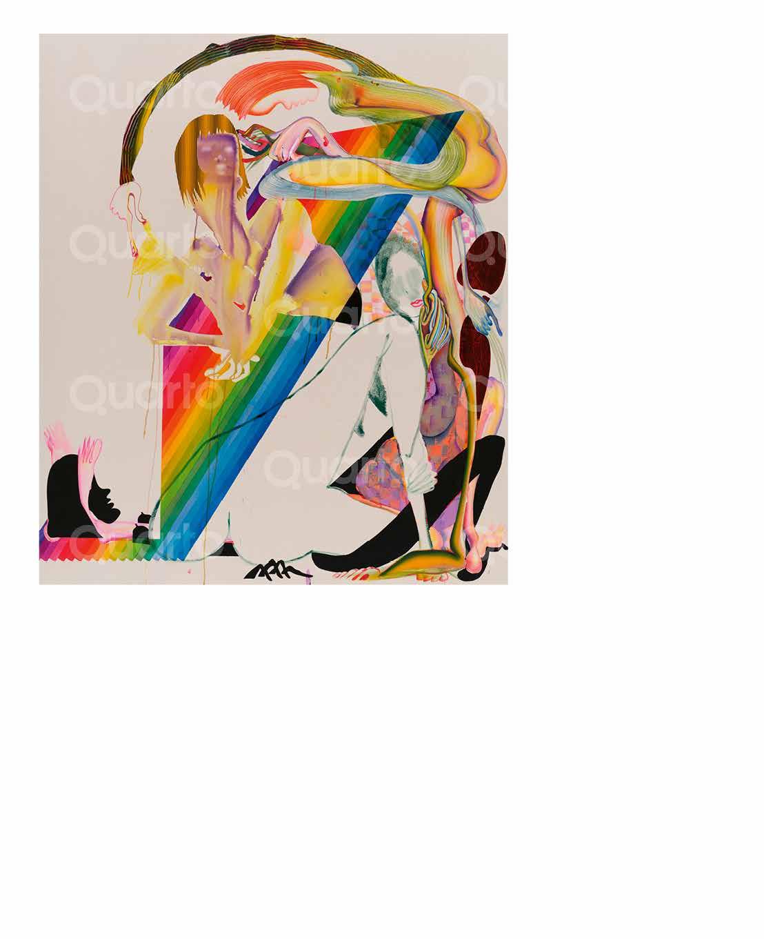 zich af in een etherisch landschap, de scherpe regenboogstrepen snijden door het beeld en door een regenboog bovenaan. Quarles nodigt de kijker uit om de diepere betekenis te verkennen van het bewonen van je eigen lichaam, en van de kracht van verbinding met andere queerlichamen en de wereld om ons heen.