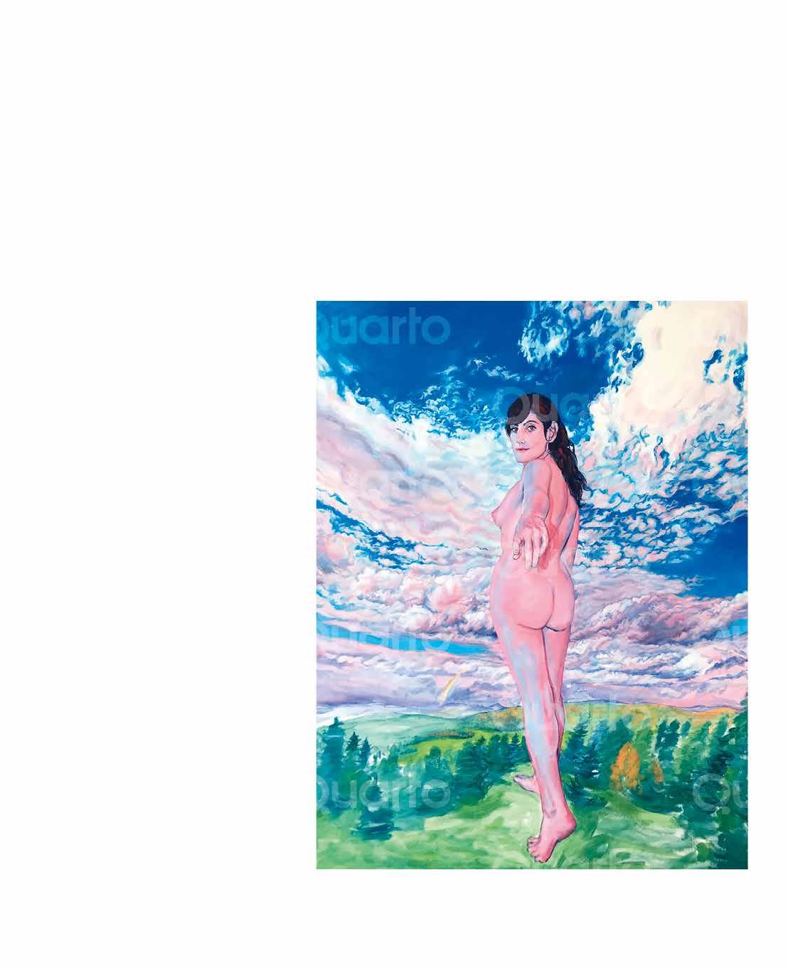 geeft: zij bezit de sleutel tot dit etherische paradijs. Glynns kenmerkende palet tekent het hele schilderij, babyroze en hemelsblauw treffen elkaar in de golvende, vlezige wolken en haar lichte huid. Er is koelte waar warmte zou moeten zijn, wat een subtiele spanning onder het oppervlak verraadt. De kunstenaar stapt een toekomst binnen op weg naar een verre regenboog achter de horizon, en neemt ons mee naar een wereld vol hoop en belofte.
