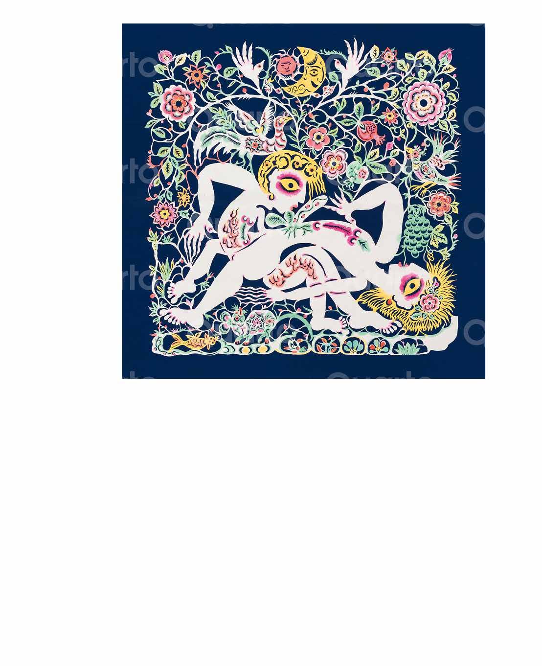 Joy 乐, Xiyadie, 1999, papiersnijwerk met kleurstof op waterbasis en Chinese pigmenten op Xuan-papier, 176 x 176 x 4 cm