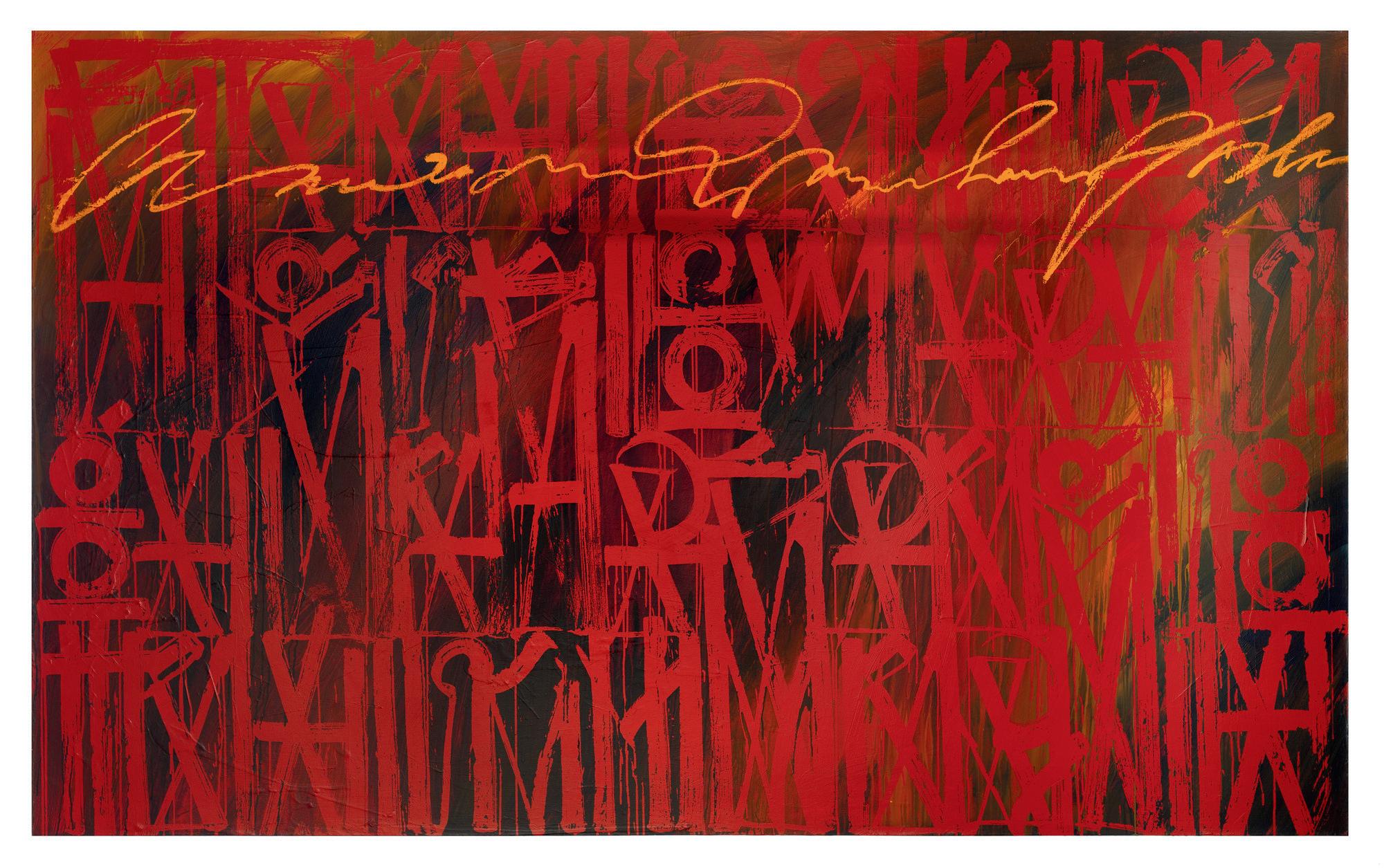 RETNA is an American street artist known for his unique typography and letterforms. RETNA combines visual linguistics, urban poetics, and appropriated fashion imagery to explore an eclectic range of media, including graffiti, photography, and painting. “It is important to have art in the streets as a cultural fabric that is woven into the city for the upliftment of civic pride,” he once stated. Born Marquis Lewis, he joined the Los Angeles mural scene as a teenager, developing his text-based signature style featuring intricate line work, complex layering, and a wide range of color. Painting with a brush in addition to a spray can, the artist achieves highly detailed line work. He has exhibited at venues throughout the world, notably including L.A. Art Machine in Los Angeles, Don Gallery in Milan, Yves Laroche Galerie d’Art in Montreal, and Art for All in Malaga, among others. The artist continues to live and works in Los Angeles, CA.