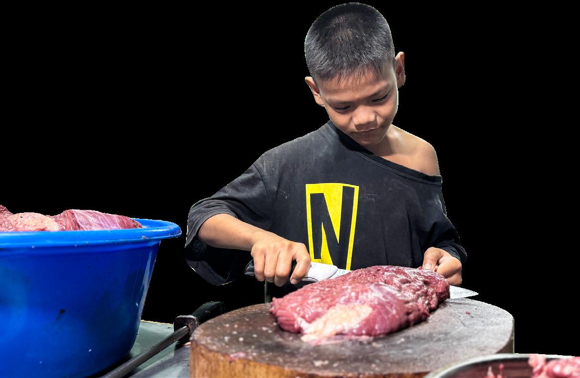 11, works diligently, slicing meat with a focus that belies his years. His story embodies resilience but also reflects the pressing issue of child labor affecting countless children in our society.