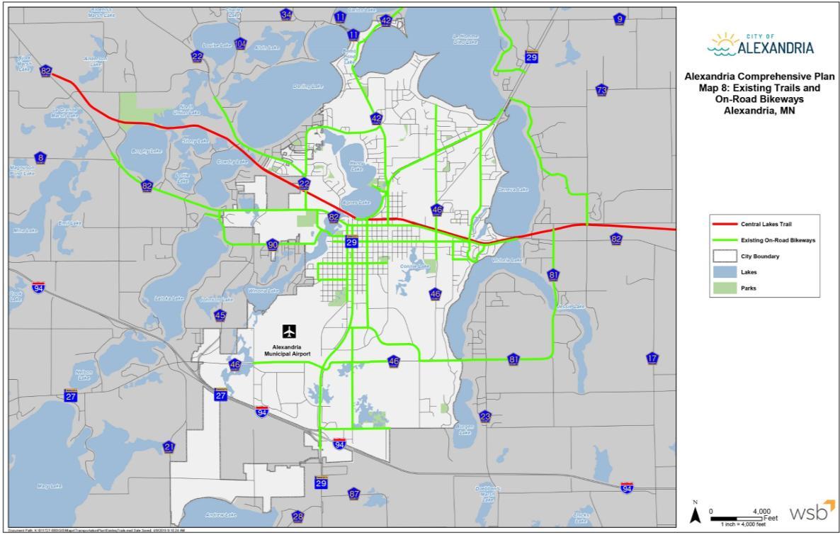 The Alexandria 2040 Comprehensive Plan was completed in 2020. Within the Transportation chapter of the plan, the non-motorized transportation network is evaluated, and recommendations are presented to create better network connectivity. Alexandria supports the use of the Complete Streets framework and creating infrastructure that is PROWAG compliant. The overarching vision for the Alexandria transportation system is that “The City of Alexandria will be a place where a local transportation network provides businesses, residents, and visitors with multiple options for mobility throughout the Community and connects the City regionally.”