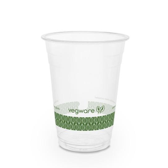 Plant based clear cup for cold drinks, desserts, crudités, mini salads, or healthy snacks. Made from PLA, a renewable material made from plants. Clear for visibility, with Vegware messaging in green. Award-winning quality by Vegware. Commercially compostable where accepted. BPI certified.
