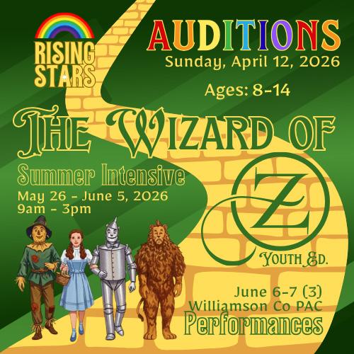For the summer of 2026, the Rising Stars production will be The Wizard of Oz: Youth Edition, a one-hour adaptation of The Wizard of Oz, specially tailored for elementary and middle school-aged actors. L. Frank Baum’s beloved story of a young girl’s adventure in a magical land has been entertaining audiences for over a century. Join Dorothy and her loyal companion Toto as they “Follow the Yellow Brick Road” through the Land of Oz, determined to reach the Emerald City, where the great and powerful Wizard of Oz will help them get home. Of course, along the way, Dorothy encounters witches (both good and bad), Munchkins, talking trees and winged monkeys. But most importantly, she befriends three unique characters: a Scarecrow with no brain, a Tin Man with no heart, and a Lion with no “nerve.” Their journey to happiness – and self-awareness – is a glowing testament to friendship, understanding and hope in a world filled with both beauty and ugliness.