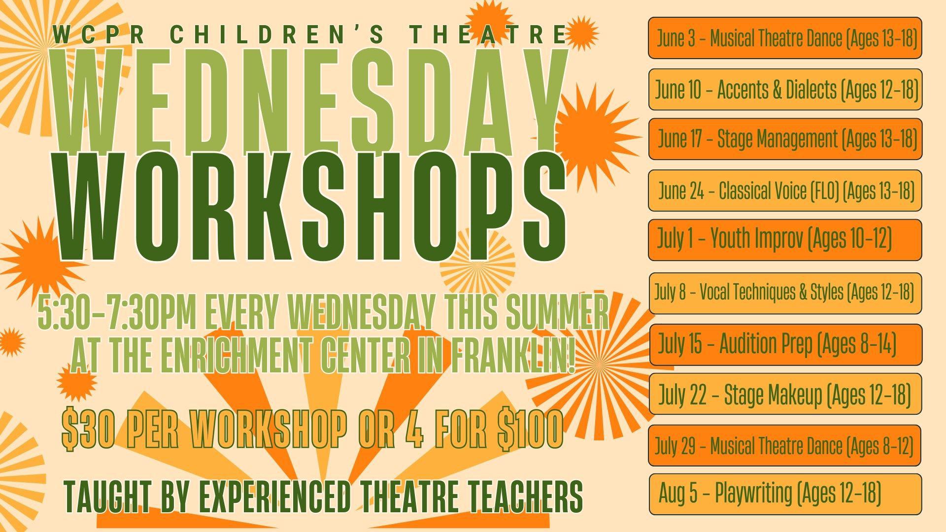 We’re offering workshops in various theatre skills every Wednesday evening this summer at the Enrichment Center! Taught by various experienced directors, choreographers, and vocal teachers from our WCPR Children’s Theatre team, you’ll learn about many aspects of theatre and improve your knowledge and skills in the theatre arts. See below for topics, ages, and instructors. At $30 per workshop or *4 for $25, it’s a great cost-effective way to gain knowledge in theater arts. For more information, please contact Alison Worden at Alison.Worden@williamsoncounty-tn.gov