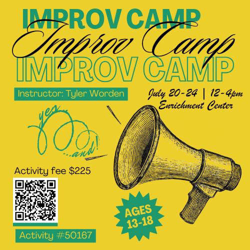 Join us for a week of fun and hilarity at this teen camp full of theater games and creativity! Improvisation is defined as making up a scene or story without a script or any prior planning. Create scenes and characters from your imagination. Work on your skills of interpretation and storytelling. Play games to understand parts of the stage, the steps of storytelling, theater rules and cooperation. The camp will culminate with an improv show for family at the end of camp on Friday. Instructor: Tyler Worden