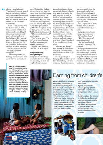 almost a hundred years. These gangs have now started buying and selling children and women too. The centre of the trafficking industry in this area is in the small town of Mae Sai, by the border with Burma. When Sompop comes here for the first time, in 1989, there are almost 60 brothels in this small town. The girls there are abused and made ready to live their lives as brothel slaves. They are told never to say where they come from, or their real age. They are given fake ID documents and sold to tourist resorts in Thailand and countries like Malaysia, Japan and Singapore. One evening in Mae Sai, Sompop meets a tourist from Australia who has been com-