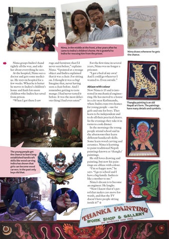 For the first time in several years, Nima was no longer a prisoner. “I got a bed of my own! And I could go wherever I wanted to. Even outside.” Ablaze with colour Now Nima is 15 and is inte rested in mechanical enginee ring. He has moved to a house in a city near Kathmandu, where Indira runs two homes for young people – one for girls and one for boys. They learn to be independent and to do all their practical chores. In the evenings they take it in turns to cook dinner. In the mornings the young people attend school and in the afternoons they learn different handicraft skills. Some learn wood carving and ceramics. Nima is learning to paint traditional Nepali paintings known as ‘thangka’ paintings. He still loves drawing and painting, but now his pain tings are ablaze with colour. “I’m so happy now,” he says. “I go to school and I have a big family. Indira is like a mother to me.” Nima’s dream is to become an engineer. He laughs. “Now I know that it’s pet rol that makes cars move for wards, and that the TV doesn’t have people sitting inside it!”