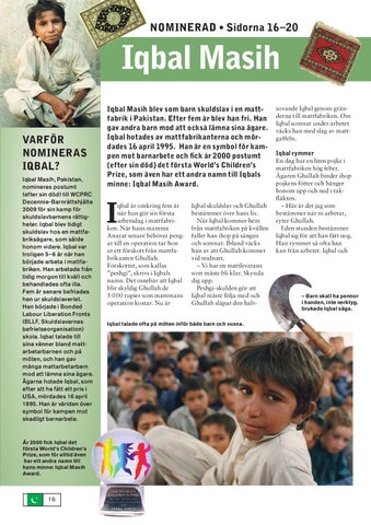 Iqbal Masih VARFÖR NOMINERAS IQBAL? Iqbal Masih, Pakistan, nomineras postumt (efter sin död) till WCPRC Decennie-Barnrättshjälte 2009 för sin kamp för skuldslavbarnens rättigheter. Iqbal blev tidigt skuldslav hos en mattfabriksägare, som sålde honom vidare. Iqbal var troligen 5–6 år när han började arbeta i mattfabriken. Han arbetade från tidig morgon till kväll och behandlades ofta illa. Fem år senare befriades han ur skuldslaveriet. Han började i Bonded Labour Liberation Fronts (BLLF, Skuldslavarnas befrielseorganisation) skola. Iqbal talade till sina vänner bland mattarbetarbarnen och på möten, och han gav många matt arbetarbarn mod att lämna sina ägare. Ägarna hotade Iqbal, som efter att ha fått ett pris i USA, mördades 16 april 1995. Han är världen över symbol för kampen mot skadligt barnarbete.