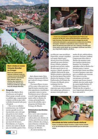 escolheram como presidente. Fiquei feliz, porque considero isso muito importante! Através da revista O Globo, aprendi que meus direitos foram violados, primeiro quando meu pai não cuidou de mim apenas por eu ser menina, e depois, quando os soldados abusaram de mim. Minhas próprias experiências me fizeram querer lutar pelos direitos das meninas. Como Embaixadora do Prêmio das Crianças do Mundo, posso realmente fazê-lo. – Ao falar nas escolas, esperamos que outras meninas não tenham que enfrentar as mesmas coisas pelas quais