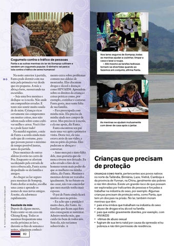 Crianças que precisam de proteção Crianças como Fanta, pertencentes aos povos nativos no norte da Tailândia, Birmânia, Laos, Vietnã, Camboja e da província de Yunnan, na China, geralmente são pobres e não têm direitos. Existe um grande risco de que possam ser exploradas por traficantes de pessoas e forçadas a trabalhar na indústria do sexo, por exemplo. Algumas crianças precisam de proteção extra, como Fanta, que tem um dos pais na prisão. No lar, também moram meninas que têm: • pais e/ou irmãos que trabalham na indústria do sexo • abuso de drogas e/ou álcool na família • pais que estão gravemente doentes, por exemplo, com HIV/AIDS • vítimas de abuso sexual • fugiram de sua terra natal por causa da opressão e/ou pobreza e não têm permissão de residência.