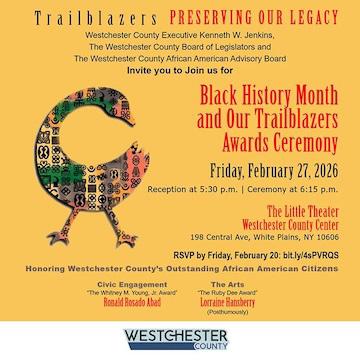 Join the County Executive Ken Jenkins and the leaders of Westchester County Government on Friday, Feb. 27th, at 5:30 p.m. in the Little Theater at the Westchester County Center, 198 Central Avenue, White Plains, in celebration of Black History Month and our 2026 Trailblazers Award recipients. Ronald Rosado Adad and Lorraine Hansberry (posthumously).