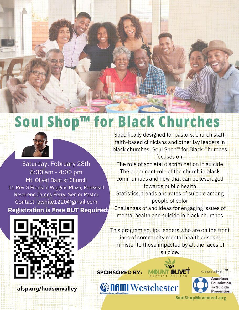 Registration: Whether you are seeking to deepen your ministry’s support for mental health or want to build new partnerships around suicide prevention, Soul Shop offers a sacred space to begin. Your presence will be a powerful part of this collective commitment to healing and hope. Please reach out to Pat White for further information pwhite1220@ gmail.com. Please feel free to forward this announcement to your network.With gratitude and appreciation to our co sponsors; American Foundation for Suicide Prevention, Mount Olivet Baptist Church, NAMI Westchester and NAACP Peekskill Branch.