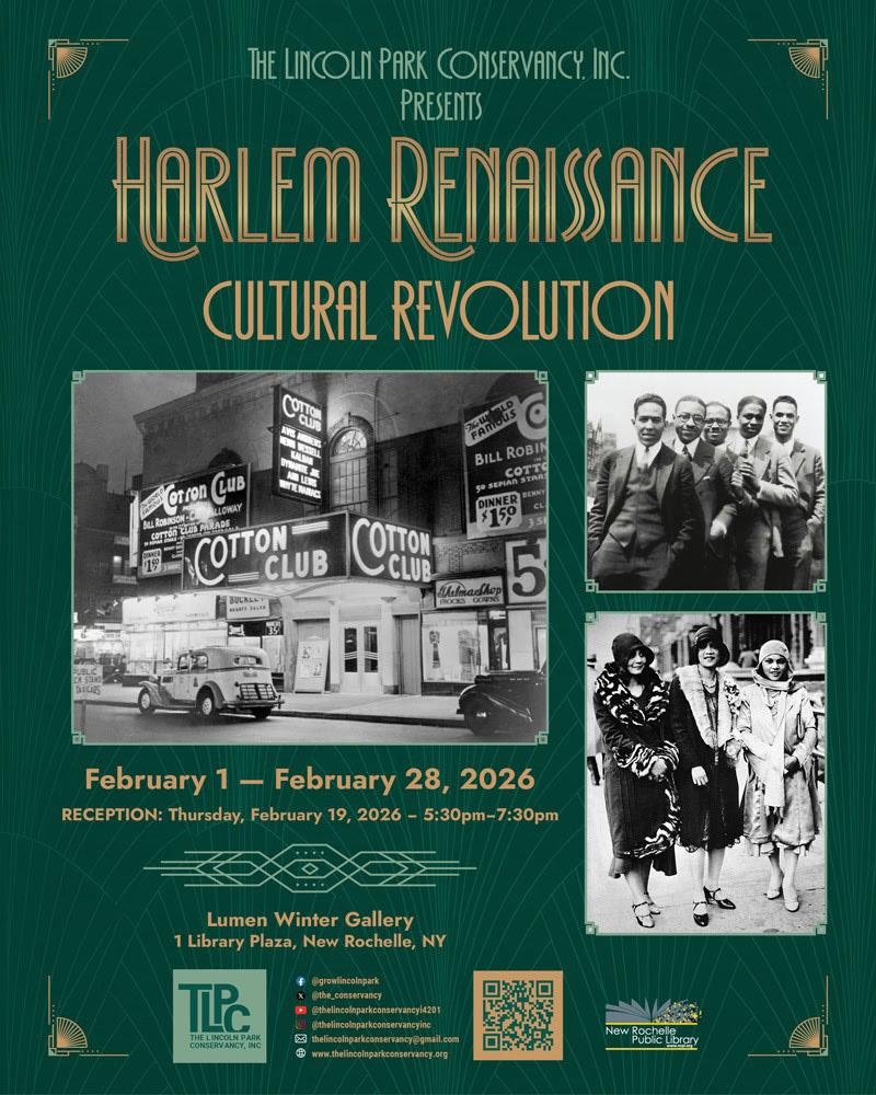 “The Harlem Renaissance on View” at the New Rochelle Public Library (NRPl). The Lincoln Park Conservancy celebrates the Harlem Renaissance, an extraordinary era of African American artistic and intellectual excellence. Spanning the 1920s and 30s, this movement—originally inspired by Alain Locke’s The New Negro—transformed American culture through music, literature, and political activism. Explore the spirit of pride and identity birthed in the heart of Harlem.Opening Reception: Thursday, February 19, from 5:30 PM to 7:30 pm.