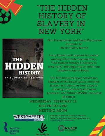 From 6:30-8:00 PM, in the Rye Free Reading Room, Rye, NY, As part of Black History Month programming, community members are invited to attend a special screening of The Hidden History of Slavery in New York, an award-winning short documentary that sheds light on a chapter of our state’s history that is too often overlooked. The 30-minute film, produced and presented by journalist and filmmaker Larry Epstein, explores the deep roots and lasting legacy of slavery in New York State, challenging common assumptions about the North’s role in the institution of slavery. The documentary features insights from Bryan Stevenson, founder of the Equal Justice Initiative and sets the stage for a thoughtful and necessary conversation. Following the screening, the program will continue with a panel discussion focused on history, accountability and the ongoing work toward repair and justice. The panel will include Tejash Sanchala, Executive Director of the Westchester County Human Rights Commission, Civil Rights attorney Mayo Bartlett and James J. Henderson III, who for the past two years has participated in the New York State Community Commission on Reparations Remedies as a member of the History of New York Subcommittee. This screening and discussion offer an opportunity not only to learn, but to engage in meaningful dialogue about how history informs present-day inequities—and how communities can move forward together with truth, understanding and purpose.