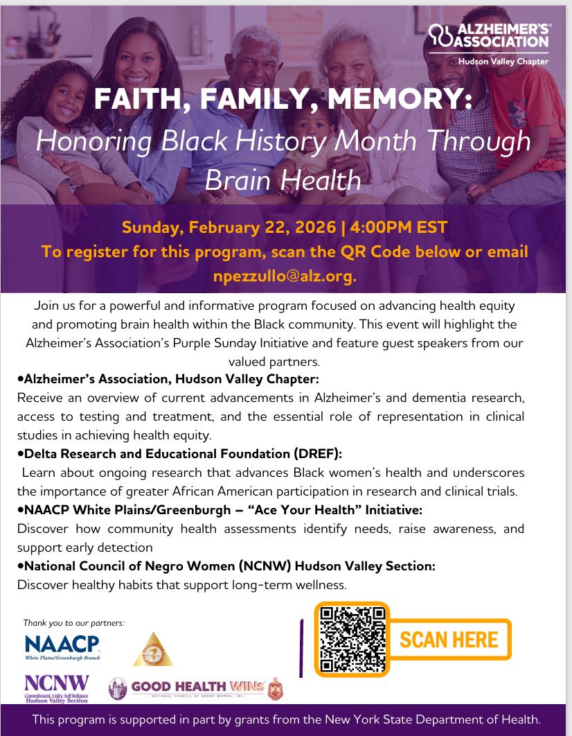 Honor Black History Month and advance health equity by attending an engaging and informative program focused on brain health, on Sunday, February 22, 2026, 4:00pm-5:00pm. The “Purple Sunday” Initiative of the Alzheimer’s Association will feature powerful testimonials from guest speakers impacted by dementia and related diseases. Register for this free virtual program via email: npezzullo@alz.org or online: https:// alz-org.zoom.us/webinar/register/ WN_vg6A_scESLei2pmG0mgW9g#/registration.