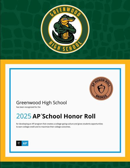 Congratulations to Greenwood High School for receiving the 2025 AP School Honor Roll Recognition. This distinction is based on three key areas: College Culture, College Credit and College Optimization.
