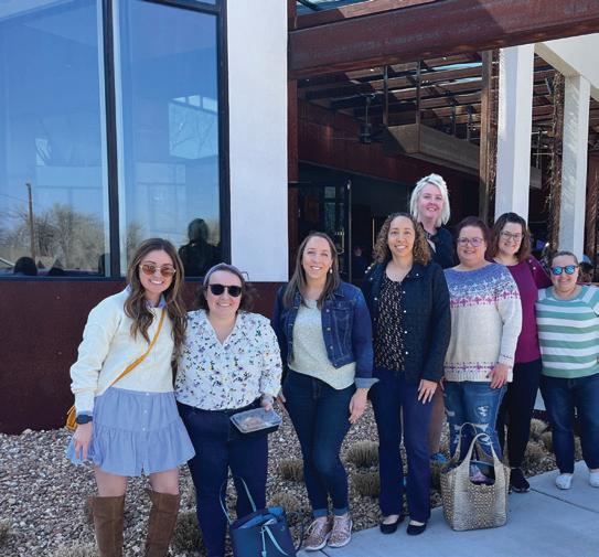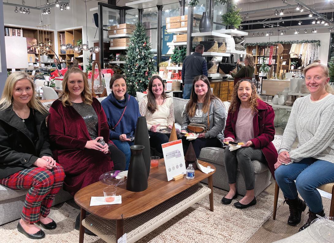 celebrate Kelli Hilgenfeld Porter being elected as President-Elect Elect. 7. The 2022-23 Mistletoe Market Committee is captured together under the mistletoe. 8. Project EmpowHer Committee Members, Evalyne Kamau, Emily Isbill and Jenefar De Leon Cossey, meet for a Project EmpowHer fall fundraiser at the Wheeler District. 9. Provisional Members Jessica Wilkes, Aubrey Frazier, Anna Long, Jennifer Higley, Sharon Leveston-Sharpe and Rose Brady, volunteer at Infant Crisis Services.