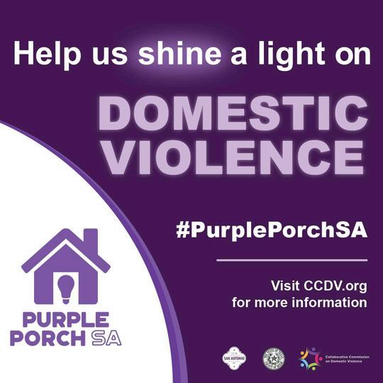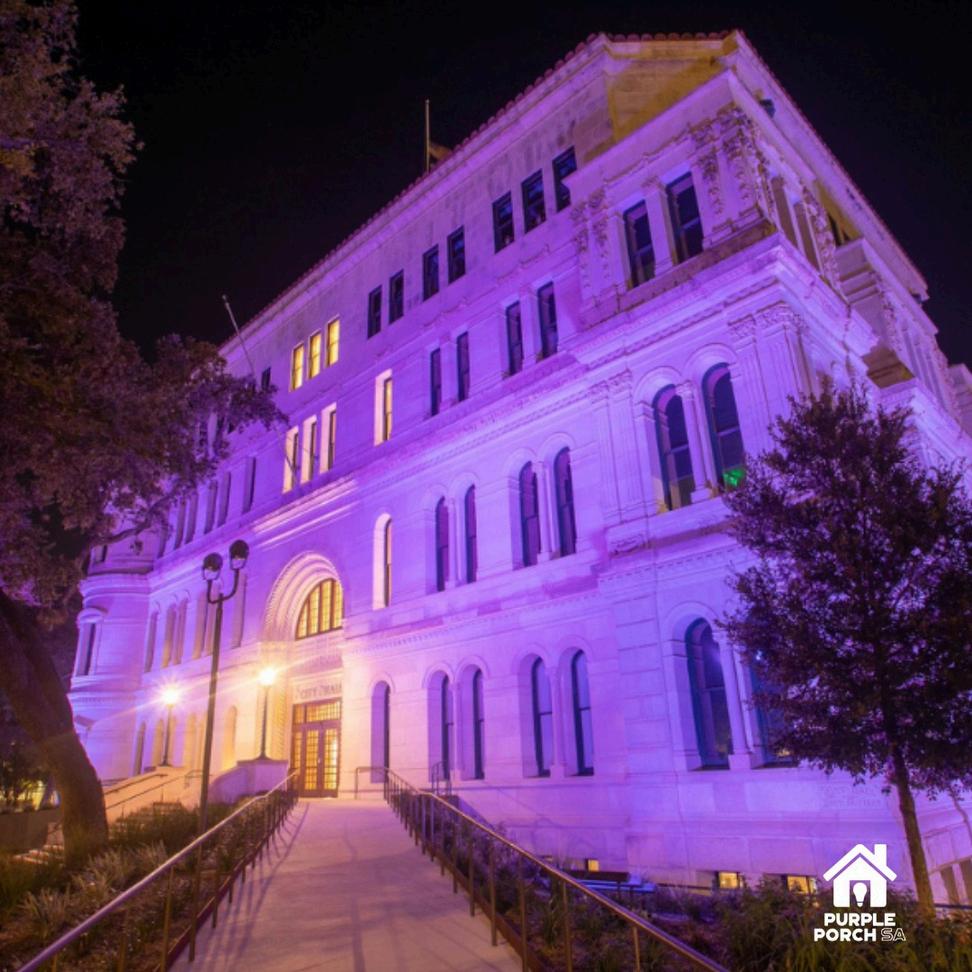 Photo: City of San Antonio Metropolitan Health District Facebook, San Antonio City Hall lit purple in observance of National Domestic Violence Awatreness Month.
