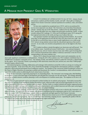 A Message from President Greg R. Weisenstein I want to express my appreciation to all of you—alumni, friends and partners, students and their families, faculty, and staff—whose gifts are helping to support West Chester University’s national reputation for excellence, value, and student success. We have just completed an exceptional year at WCU, and we are positioned for an even more impressive year ahead. The University is one of just three Pennsylvania schools—and the only one in the State System—ranked in the top 100 Kiplinger “best buys” among 500 public four-year colleges and universities around the country. In their recently released 2013 rankings, U.S. News and World Report names WCU among the best regional universities in the north, moving us up 14 places this year. Our reputation translates into high interest among potential students. We received more than 14,350 applications for the fall 2012 first-year class of just over 2,300. Also for this fall, we received three times as many transfer applications as we could accept. WCU attracts strong students and provides the educational experiences they need to succeed. As one result, our retention and graduation rates are the highest in the State System. WCU student excellence extends throughout our classrooms and well beyond. Two of our athletic teams—baseball and women’s field hockey—won national championships this past year, and our women’s lacrosse team came within a goal of joining them. WCU is the first Pennsylvania State Athletic Conference university to win two NCAA championships in the same academic year. Much as WCU alumni become leaders in their careers and communities, our students make significant contributions as undergraduates. During the 2011-2012 academic year, WCU students contributed close to 350,000 hours of volunteer community service. Our students, faculty, and staff also continue to make the University a cultural leader for the region. WCU University Theatre is presenting its 50th-anniversary season this year, and last year, more than 79,000 people attended campus cultural events. International programs, including collaboration and exchanges with institutions around the world, are among our exciting and vital areas of growth. At the end of May 2012, WCU hosted the Knowledge Crossing Borders international conference on higher education, which attracted participants from 20 different countries. The members of the concurrent Global Presidential Conclave on the Future of Higher Education are preparing to publish and disseminate the Conclave’s recommendations, which call universities around the world to action in addressing the most critical issues of our time. West Chester University is vigorously preparing for an outstanding future. The University’s new strategic plan, titled Building on Excellence, is now in the final stages of development and will guide the University over the next decade. The strategic-planning process has included extensive academic planning as well as development of a facilities master plan. The emphasis in all cases is on student success. The work of a great university such as ours demands excellent facilities for its students and programs. Particularly newsworthy this year is the opening of our magnificent Student Recreation Center, which provides vastly increased opportunities for WCU students to participate in recreation and socialize right on campus. The Rec Center is a student-initiated and student-supported project, leaving funds available to advance other critical capital improvement projects, such as added classroom and office space and progress toward implementing geothermal heating and cooling in all of our campus buildings. Along with our quality, planning, and innovation, the dedicated support of donors such as you is critical to the University’s continued excellence. We appreciate that our campus-wide growth in reputation has led to enthusiastic pride in WCU and a desire to invest in a winner with a very bright future. I greatly value your generosity and high regard for West Chester University. In closing, I again want to express my sincere gratitude for all that you do to ensure access to WCU for qualified students and to enhance the strength of our programs. You are contributing to the University’s ongoing success—expanding the quality of life for our students and alumni and serving communities throughout the region and beyond. I look forward to seeing you on campus throughout the year!