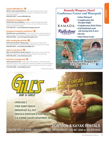 100 Fairway Drive, Iola. 80 sites with water & electric. Swimming pool, playground, game room, volleyball, horseshoes, pavillion. Theme weekends with movie nights. A fun family campground where memories are made! (715) 445-3489 | www.IolaPines.com continued on page 12