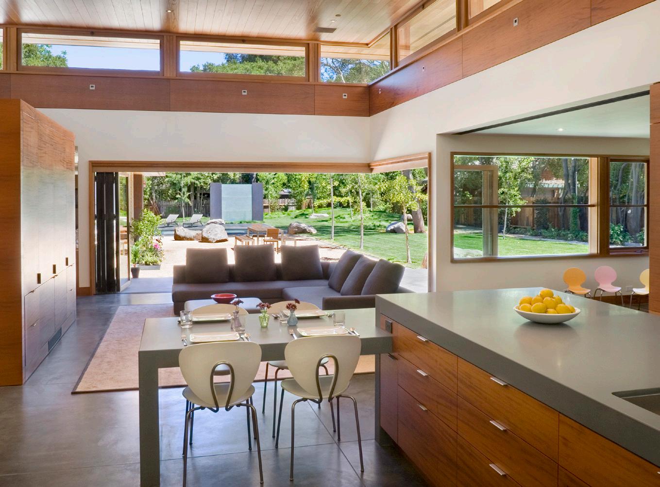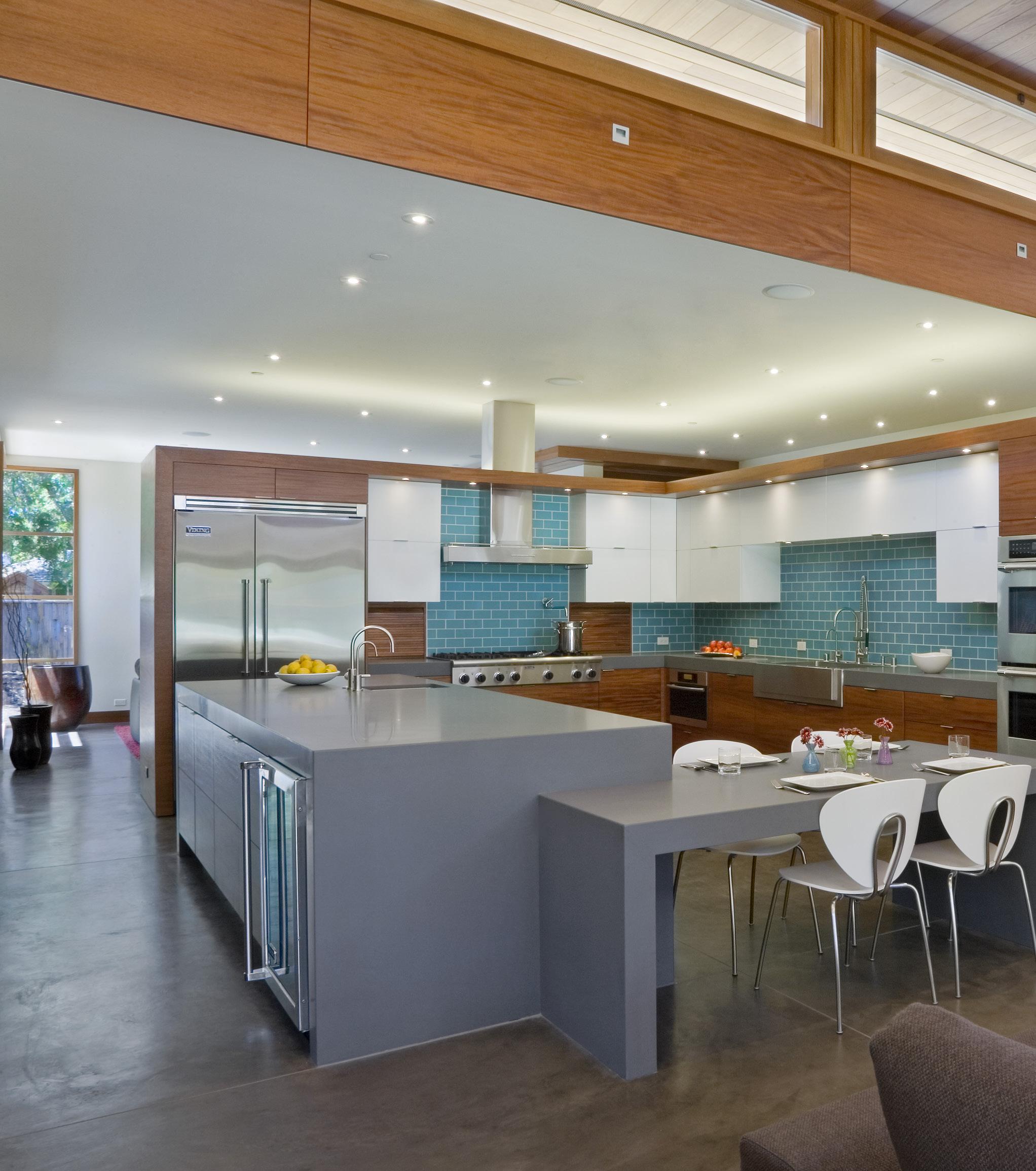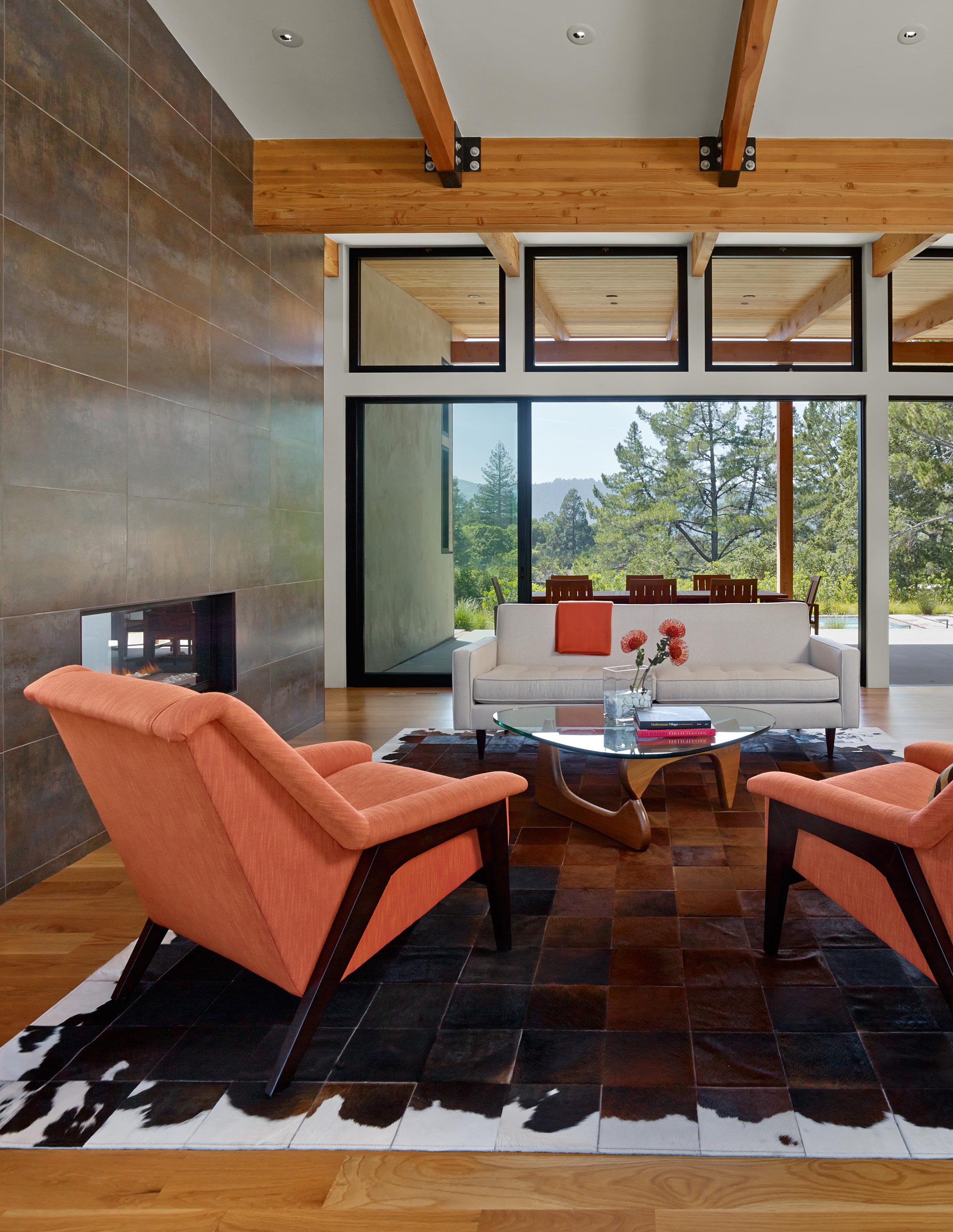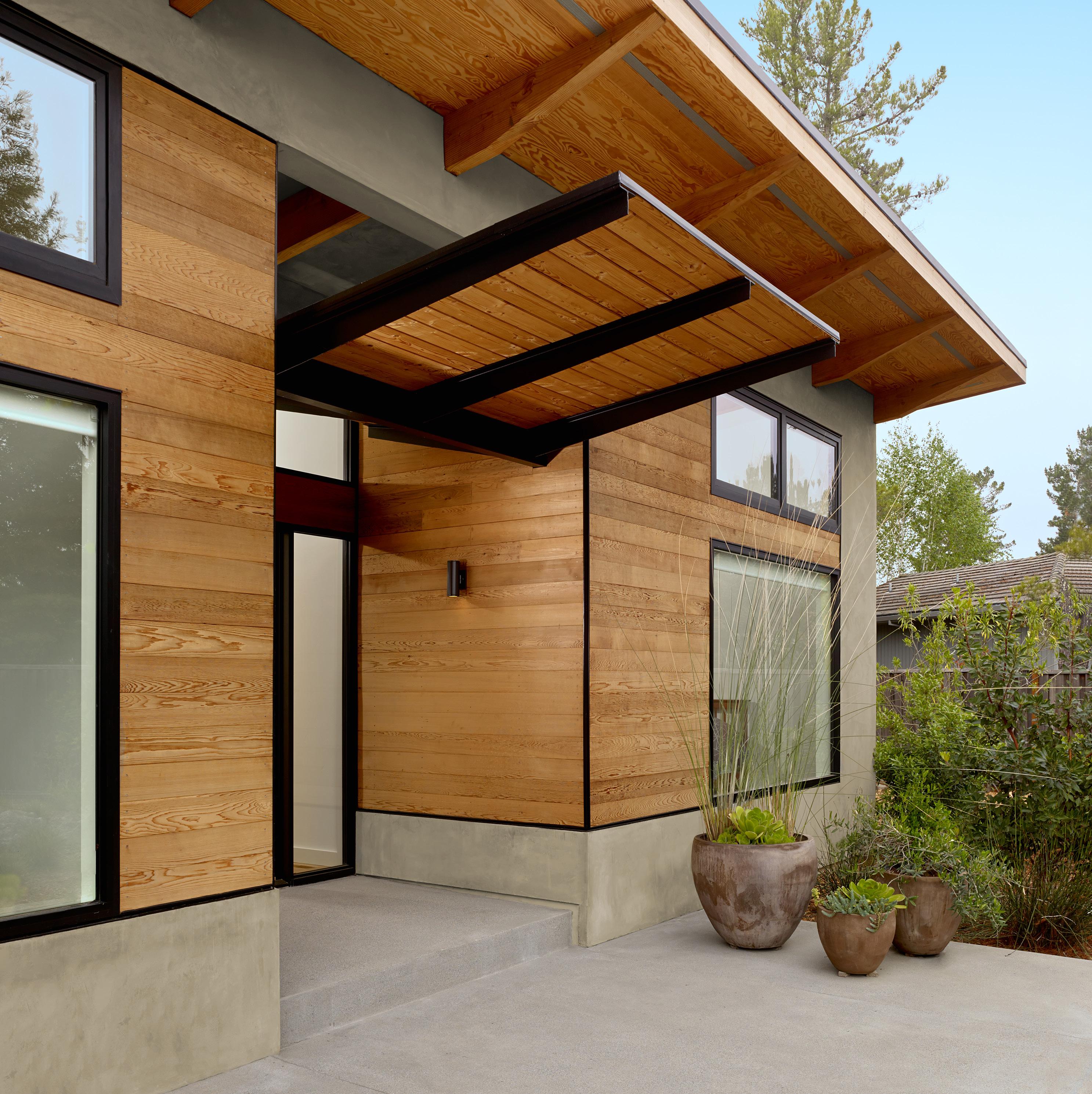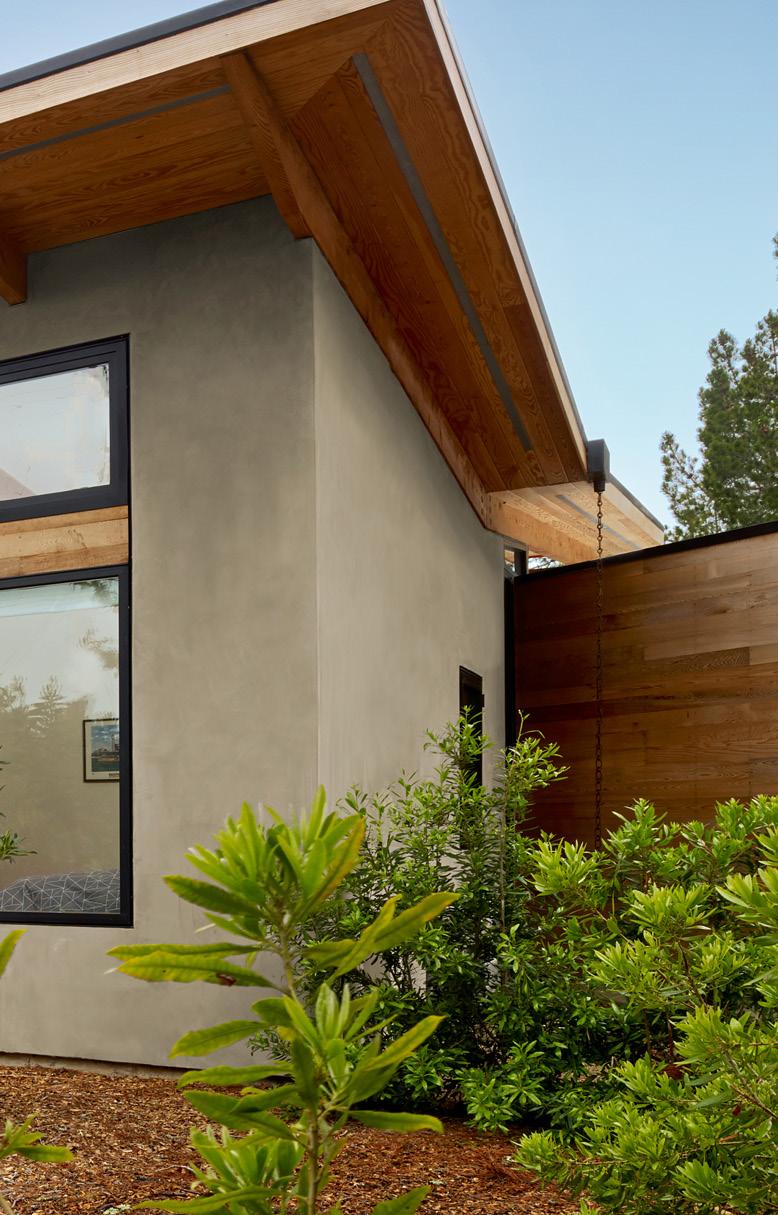 The textured tile floor and use of natural wood fixtures are balanced by the simplicity of the white soffit and black exposed ceiling.