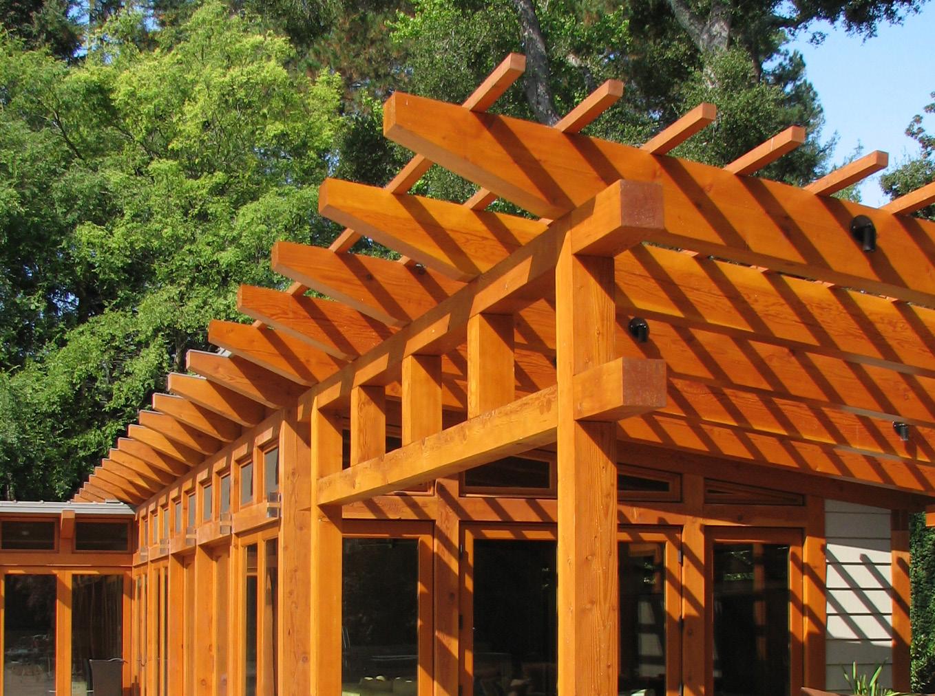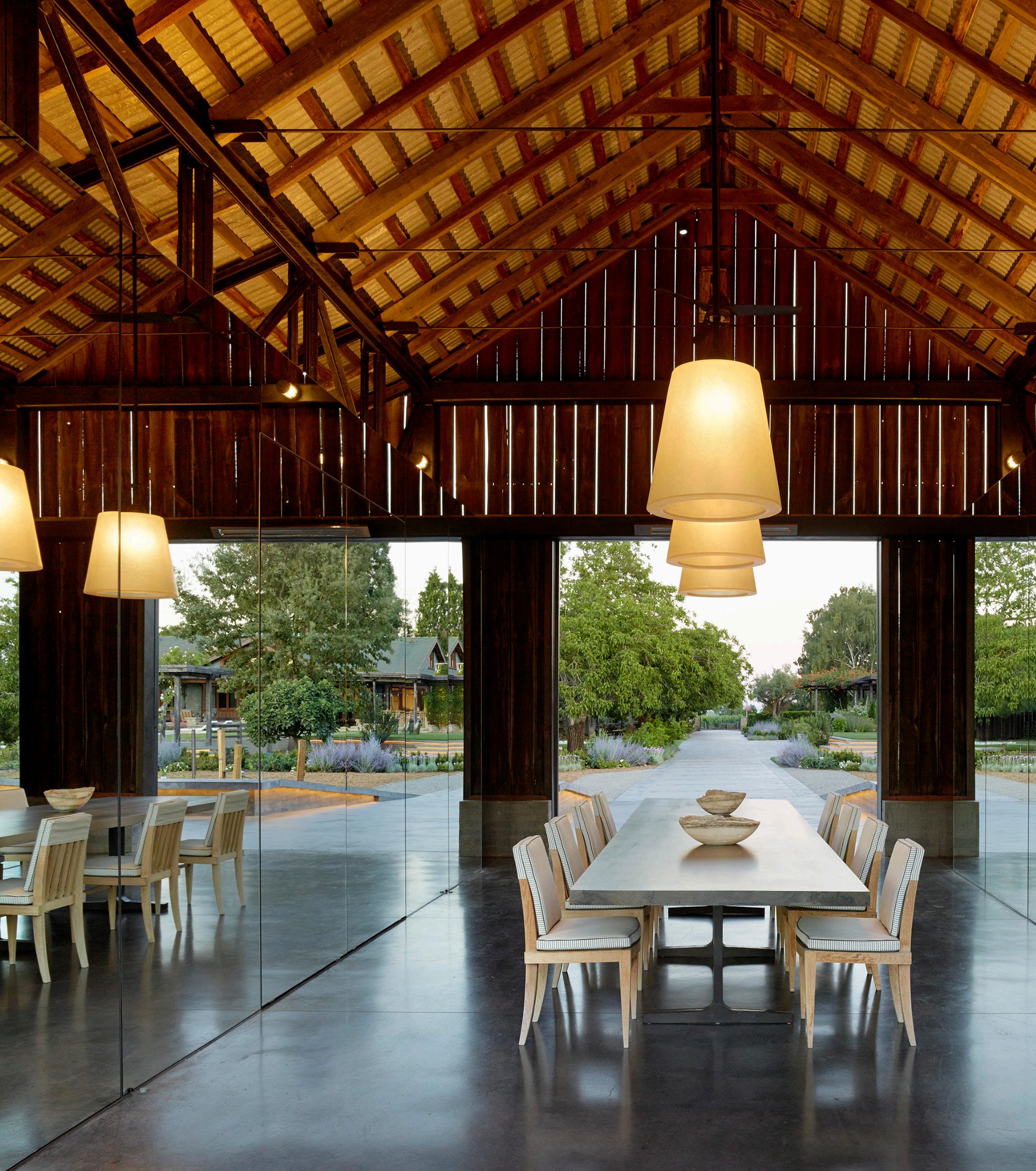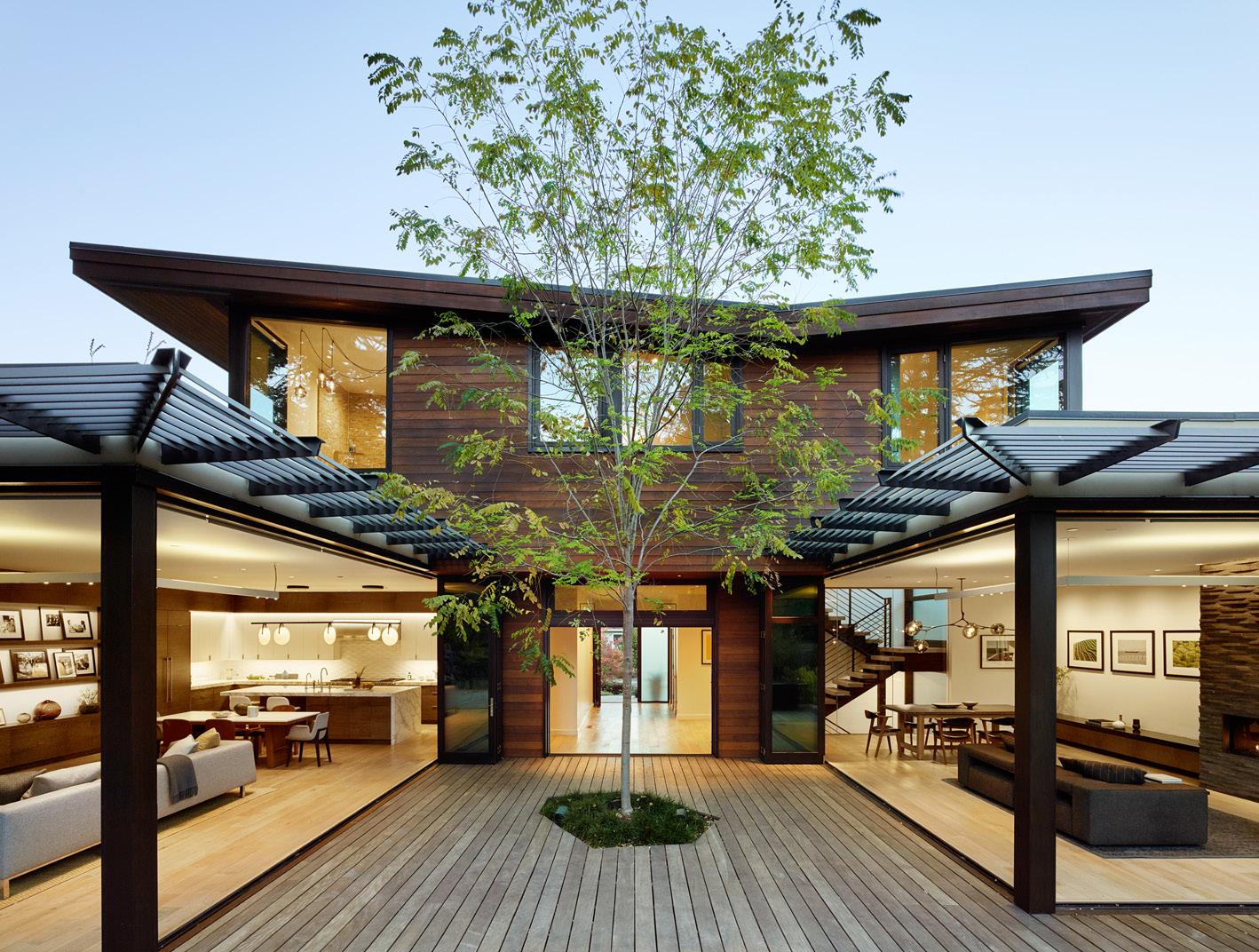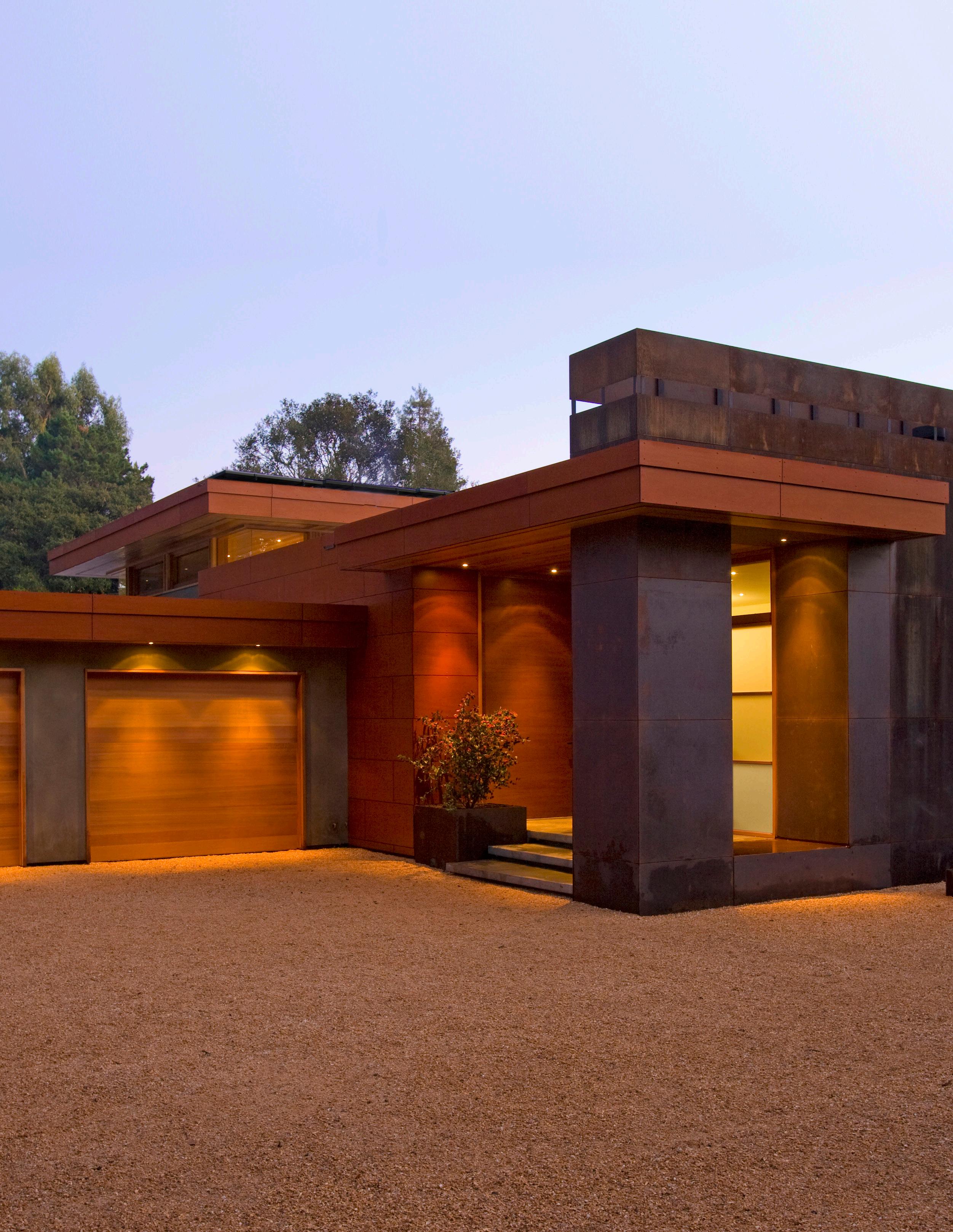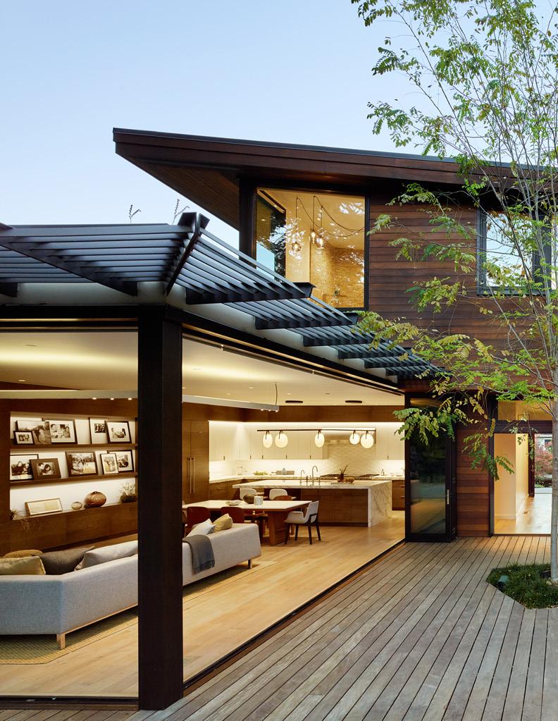 The textured tile floor and use of natural wood fixtures are balanced by the simplicity of the white soffit and black exposed ceiling.