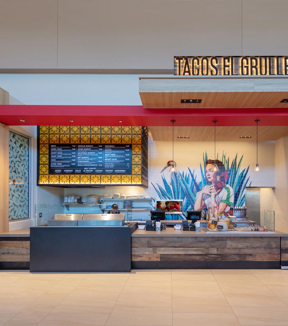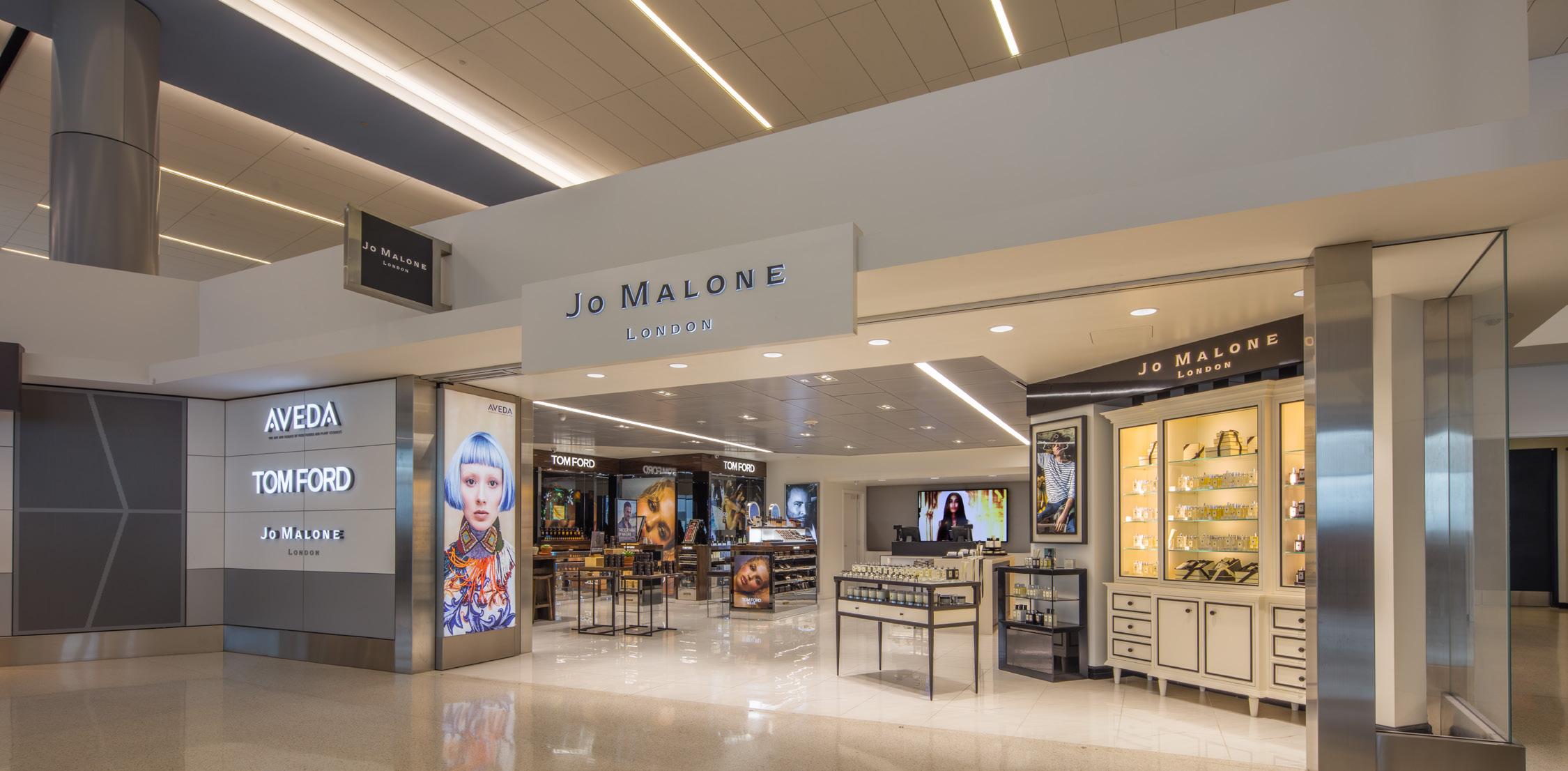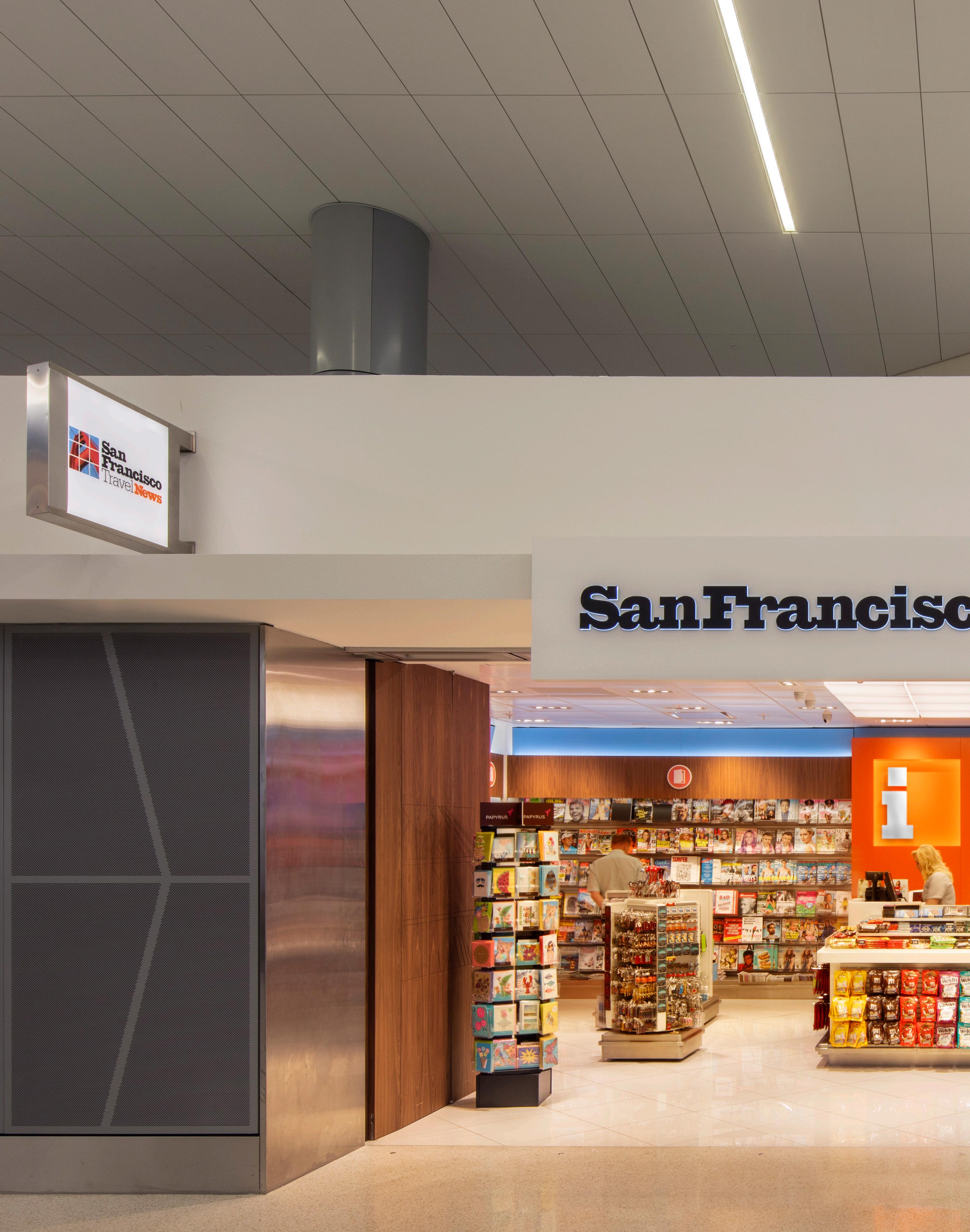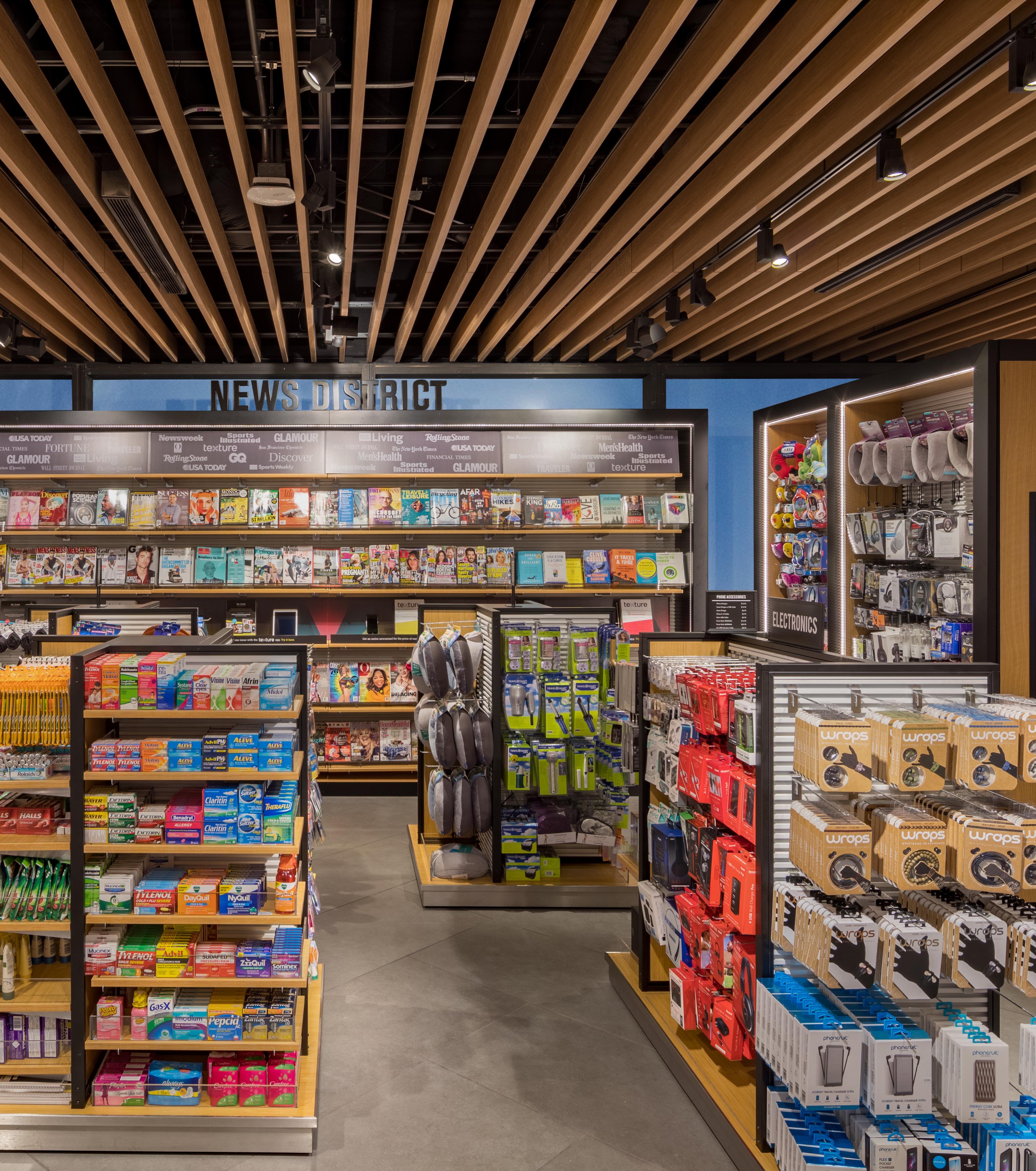 The opening of this store across the airport concourse coupled with the ceiling baffles and a hint of sky beyond creates a horizontality to the space that imbues it with a dynamic energy.